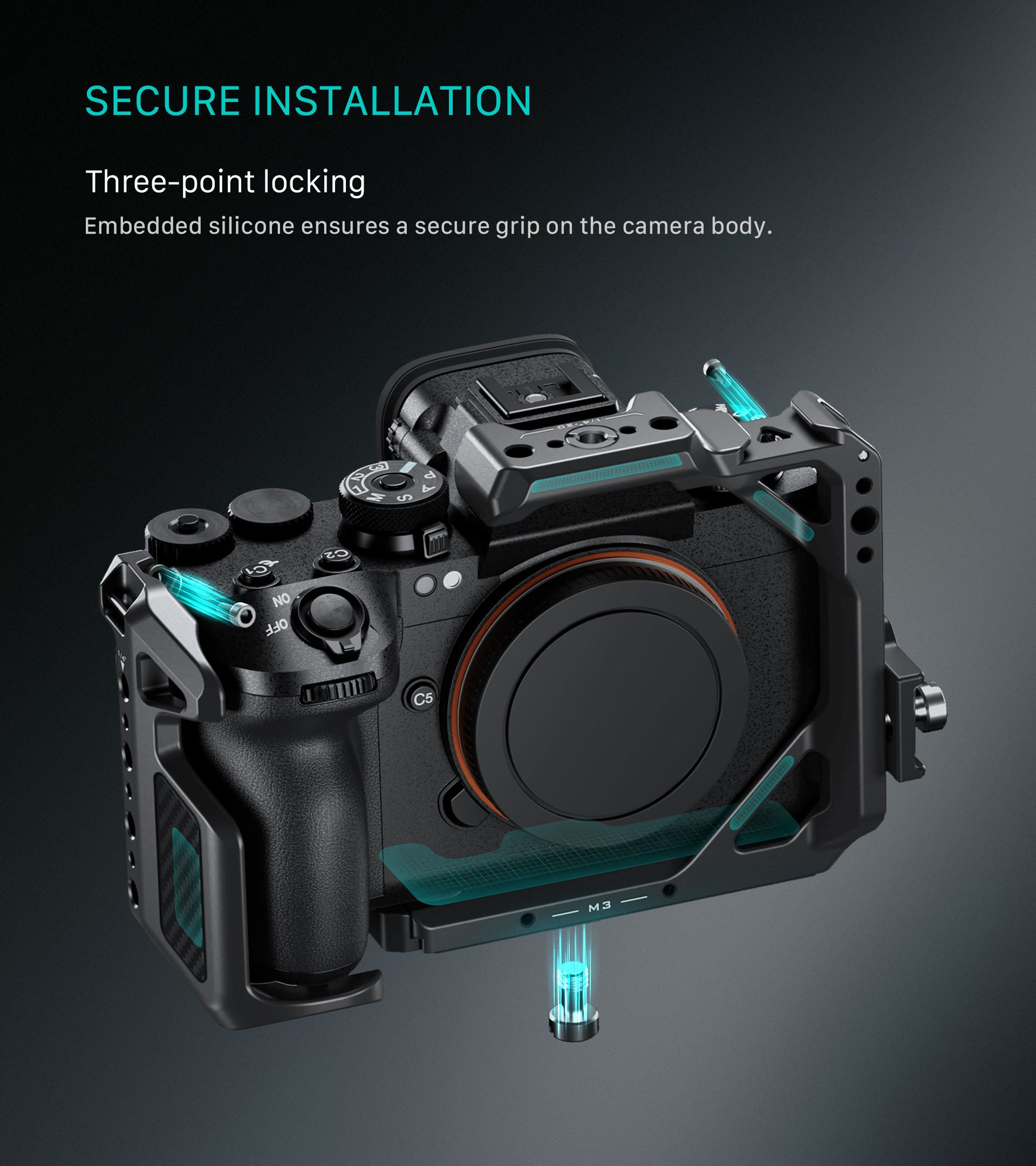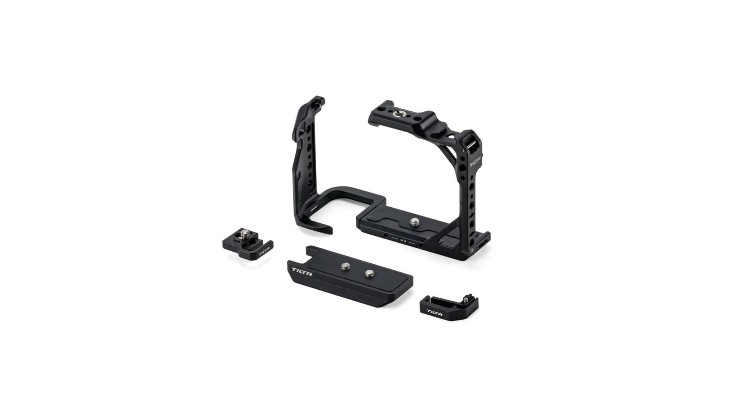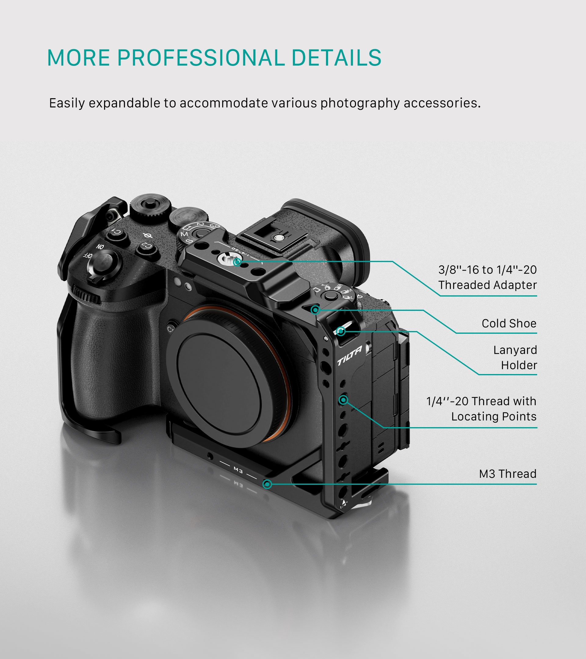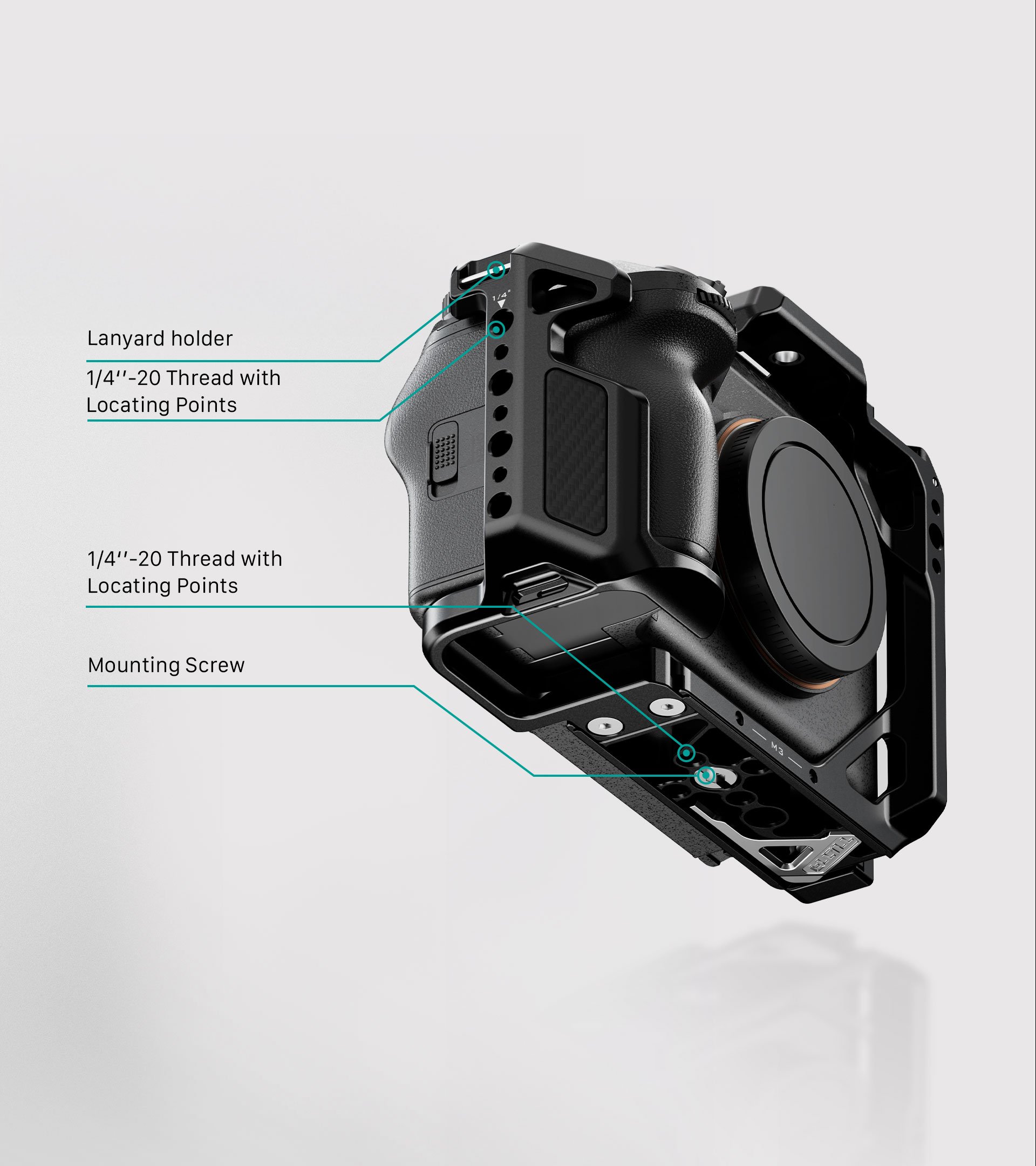 La jaula Full Cage está equipada con un receptor Cold Shoe, una rosca M3, una rosca de 1/4″-20 con puntos de referencia y un adaptador de rosca de 3/8″-16 a 1/4″-20.