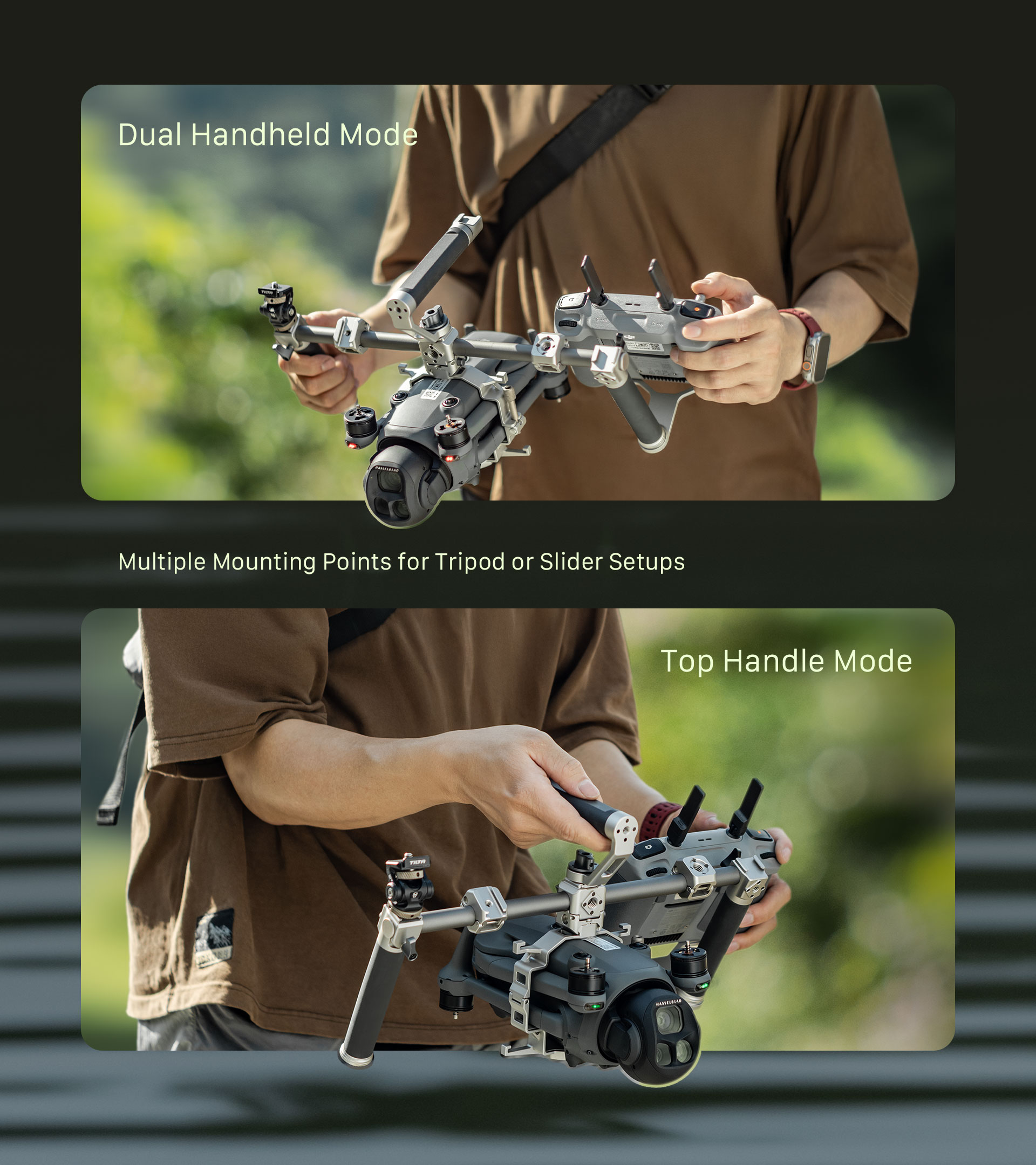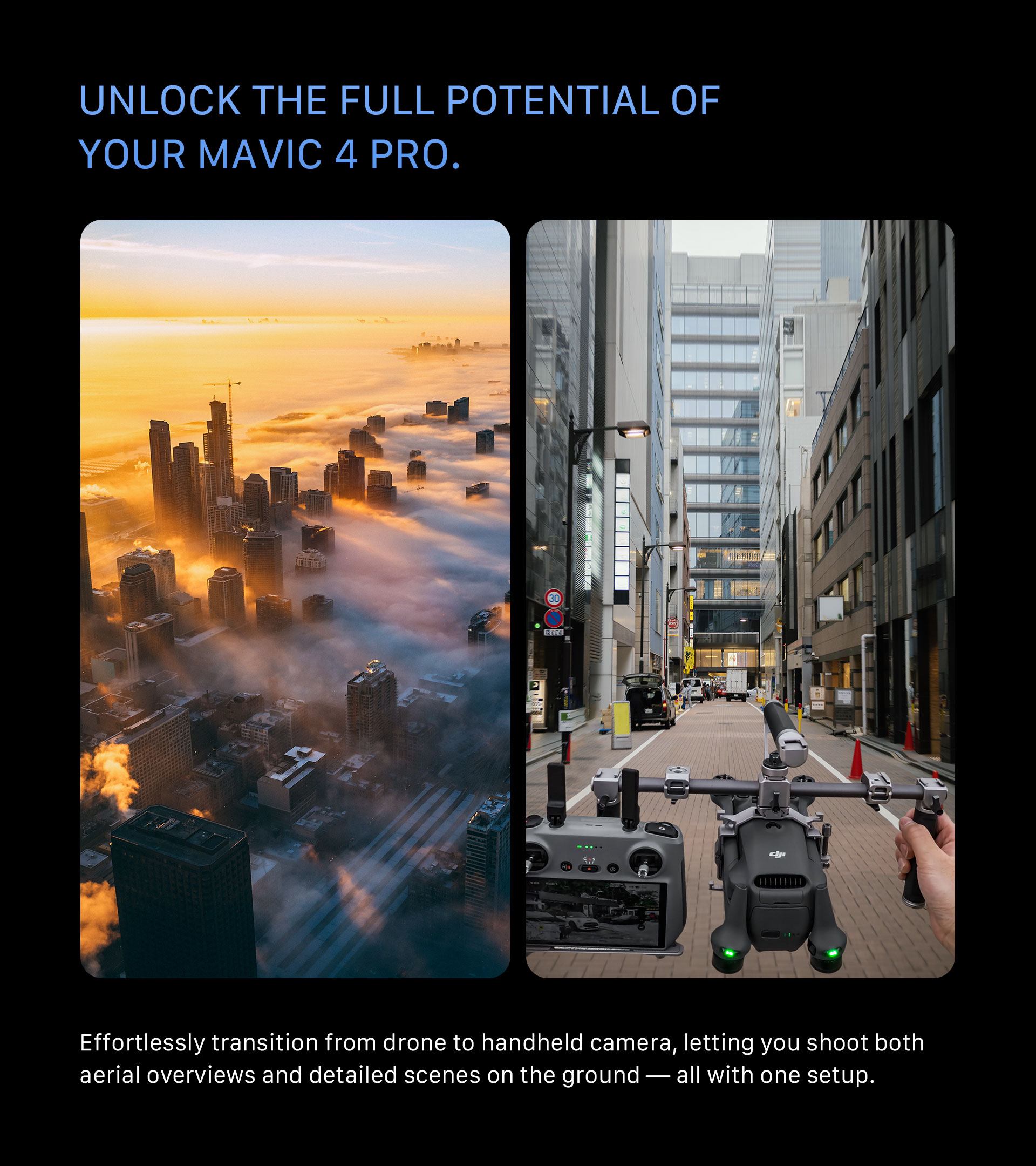 Este sistema de soporte manual abre nuevas posibilidades creativas al convertir tu dron en un equipo de cámara manual totalmente funcional.