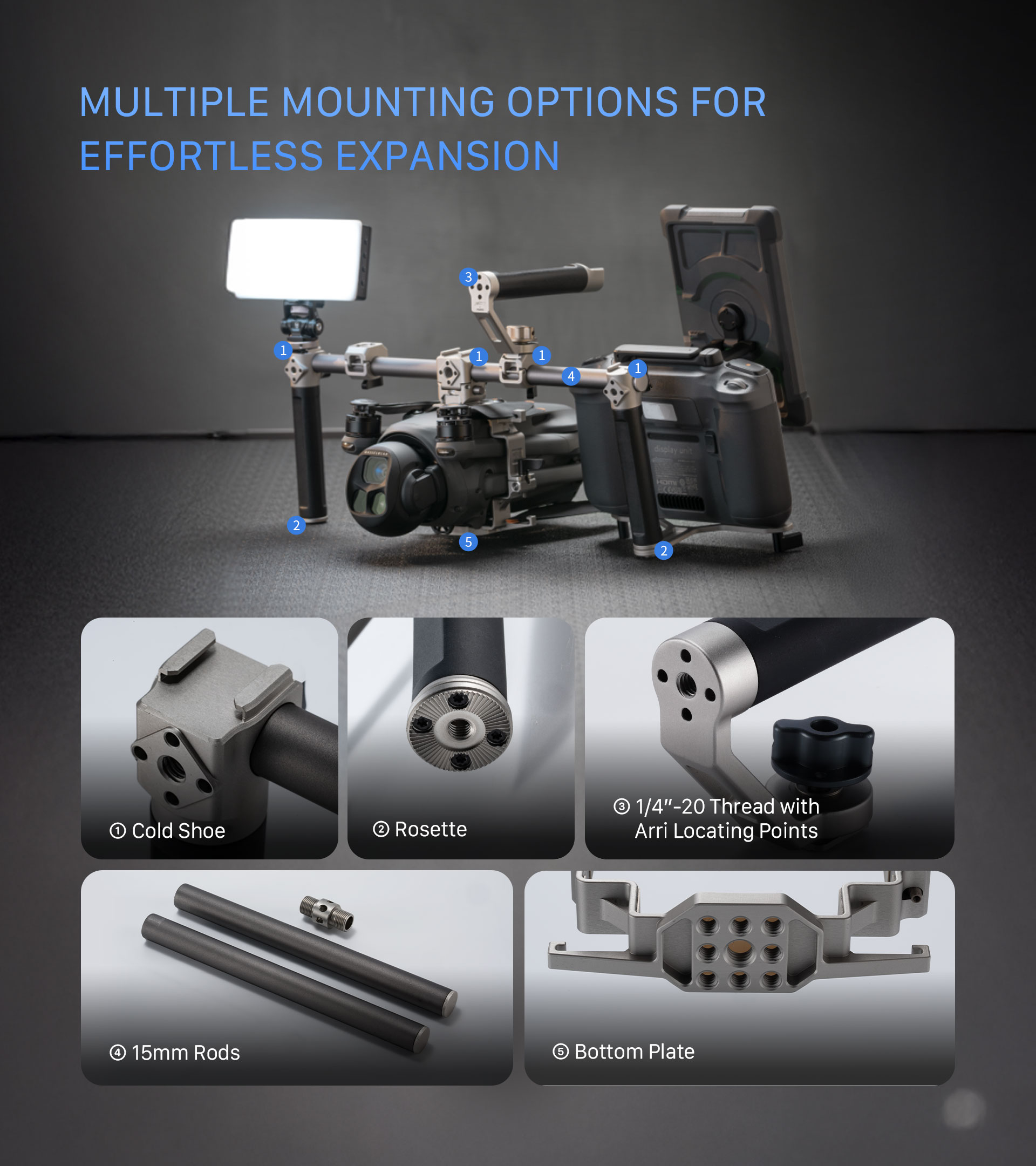 Otros puntos de montaje, como el receptor Cold Shoe, la barra de 15 mm, la roseta y las roscas de 1/4″-20 con puntos de posicionamiento, amplían las posibilidades de conexión de diversos accesorios, como por ejemplo luces de a bordo.