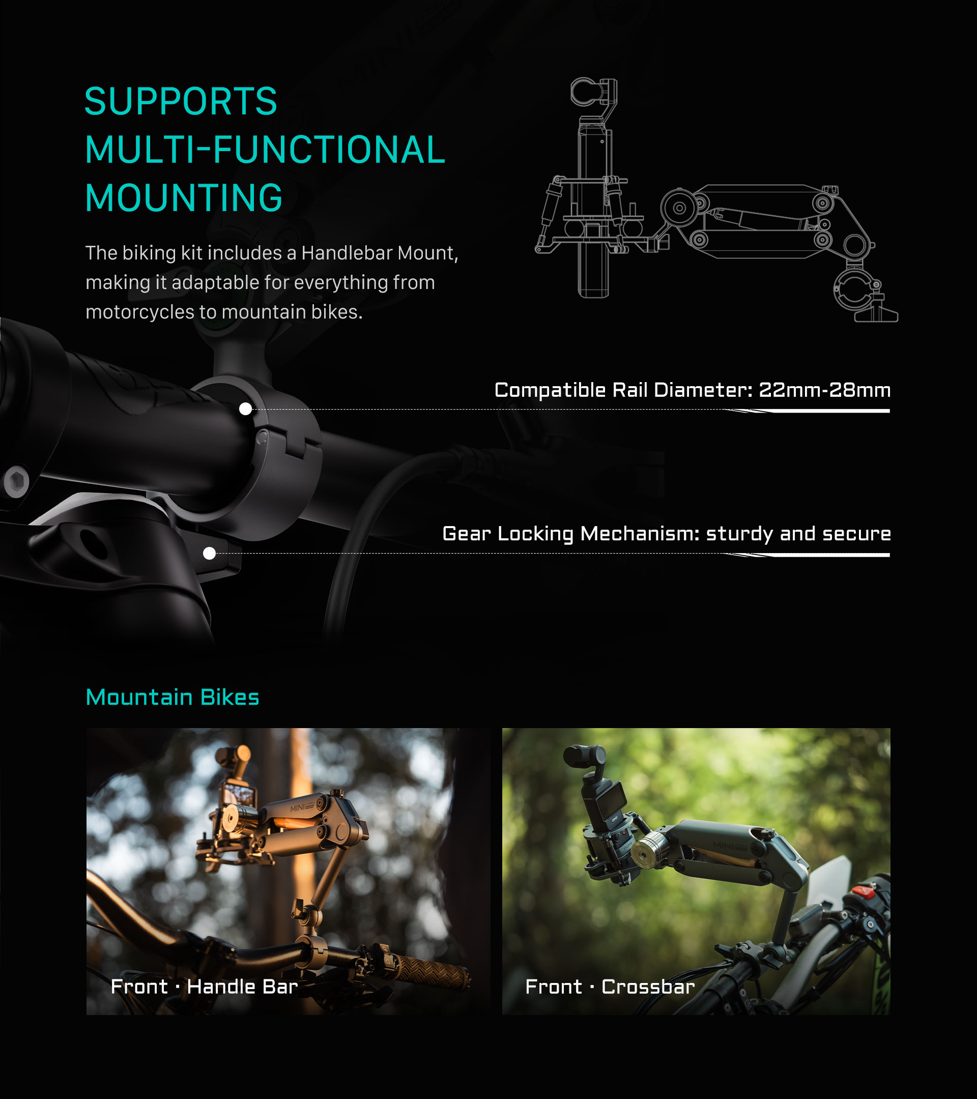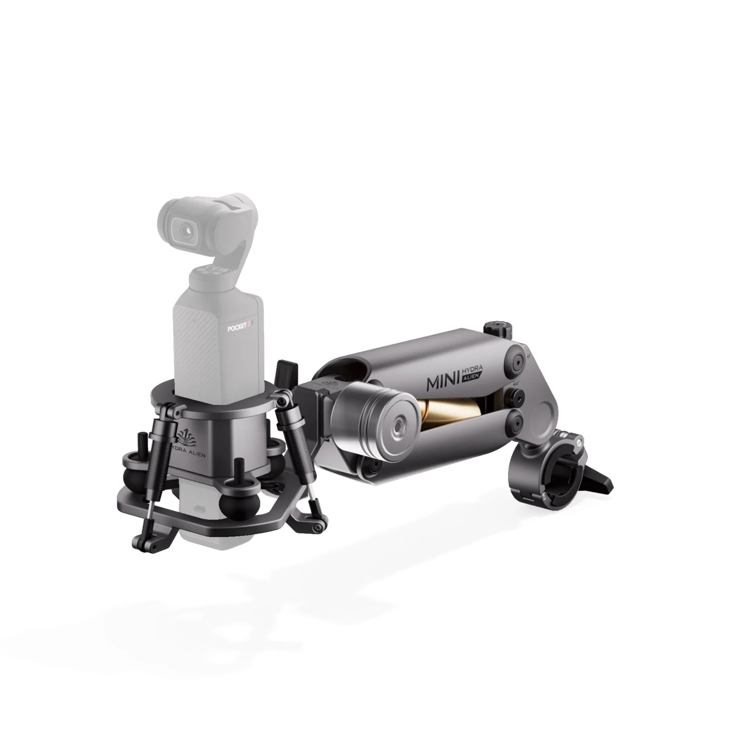 Este accesorio con abrazadera de sujeción está equipado con un manguito extraíble para manillares de 22,2 mm o 28,8 mm de diámetro. Esto permite a los usuarios fijar fácilmente el Hydra Alien Mini a vehículos que no son compatibles con la ventosa tradicional.