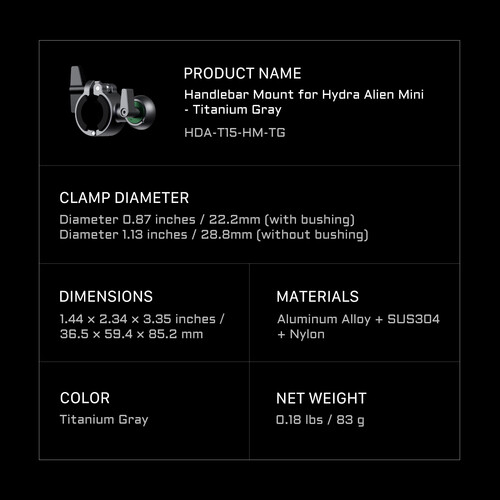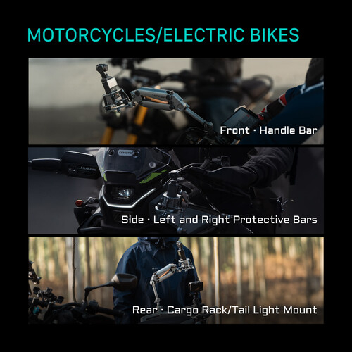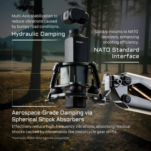 La plataforma de estabilización multieje Hydra™ aísla además las vibraciones de alta frecuencia y garantiza grabaciones fluidas incluso en terrenos irregulares. El cabezal de amortiguación está optimizado para la DJI Osmo Pocket 3, mientras que el soporte para manillar es compatible con diámetros de 22,2 mm y 28,8 mm, por lo que se adapta a diferentes tipos de vehículos.