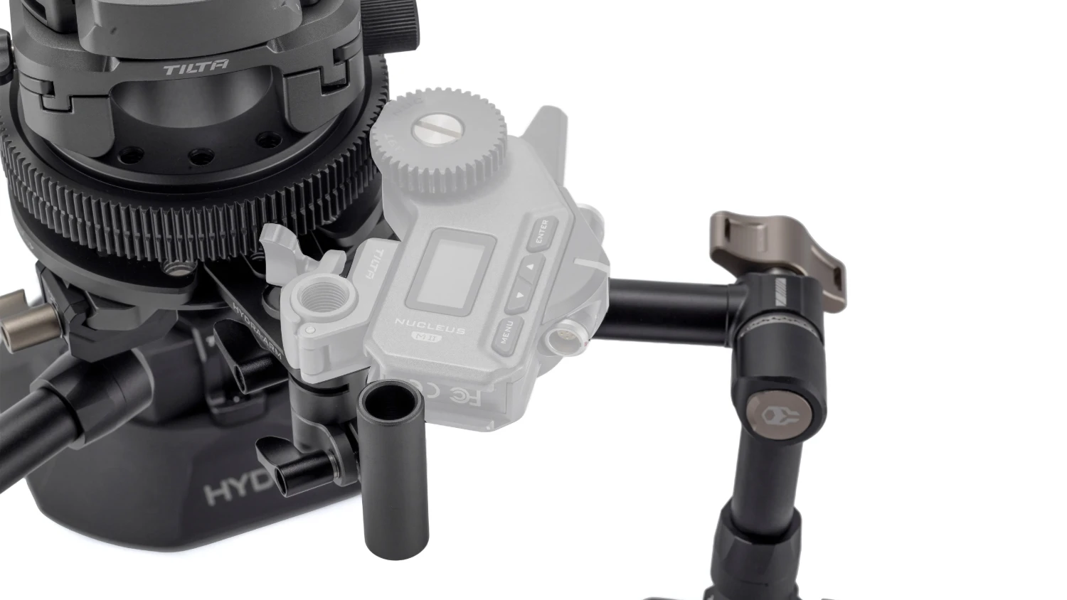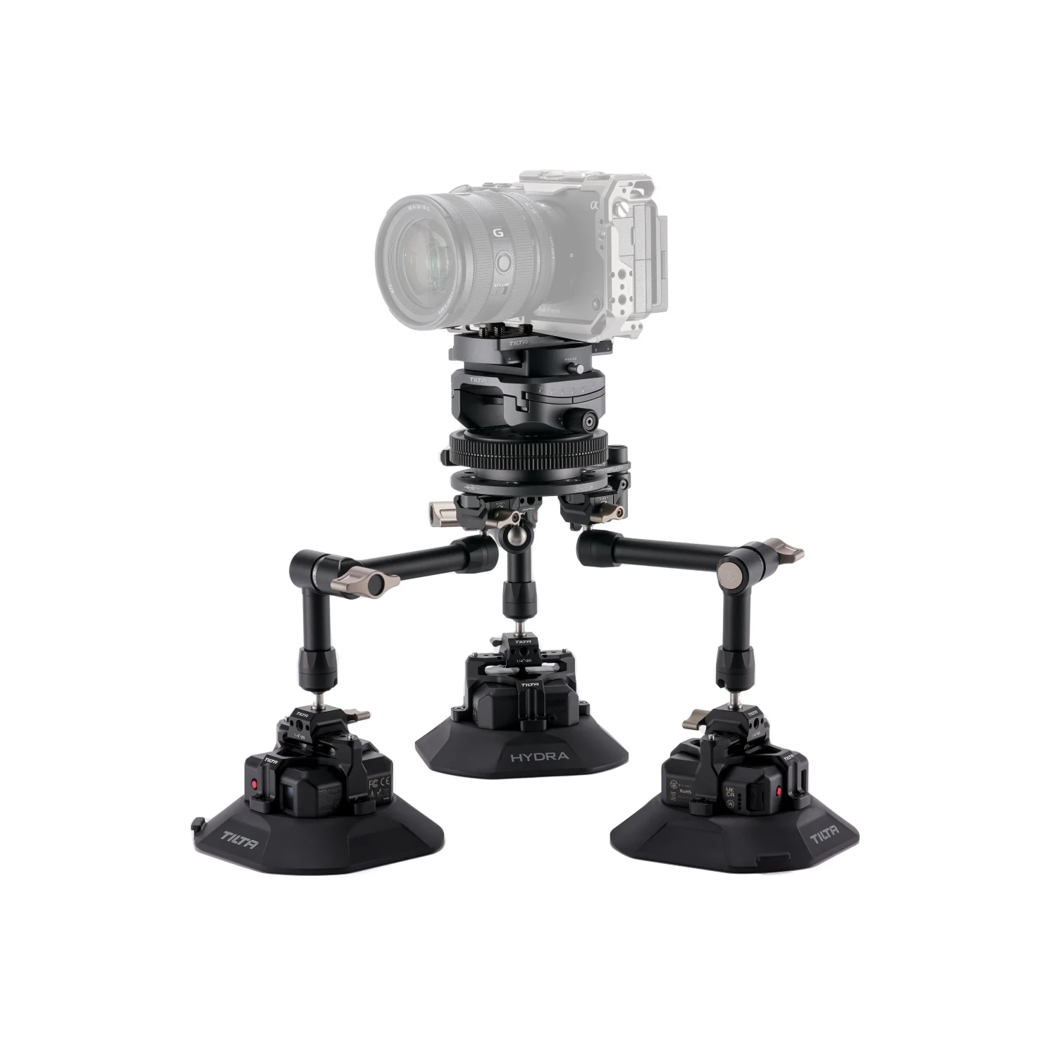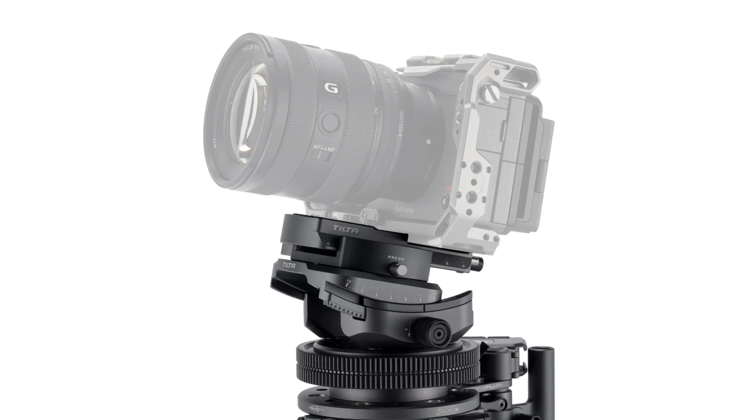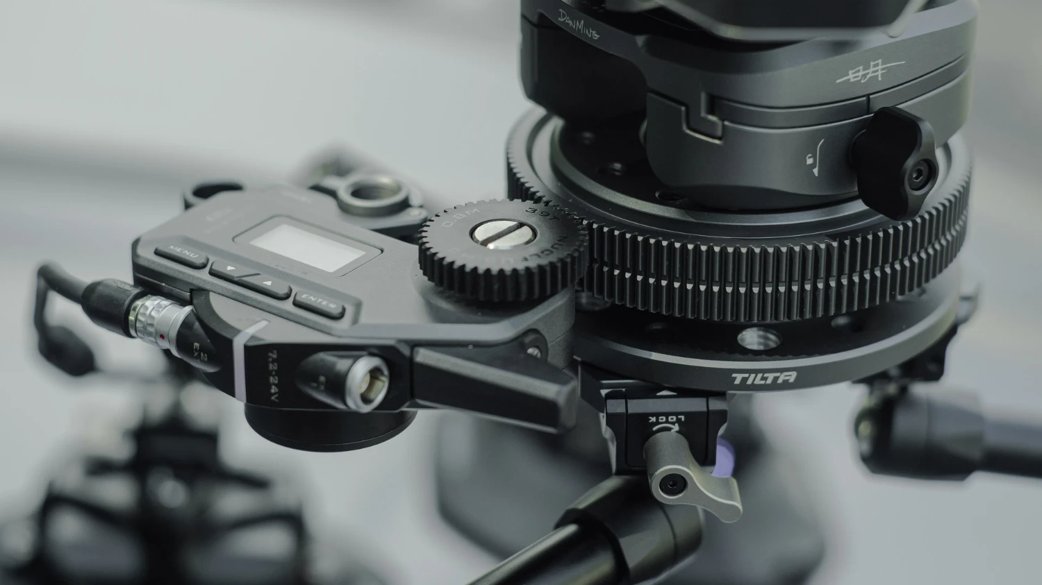 La base de este sistema es una plataforma giratoria con engranajes para accionar el motor de enfoque. Las cámaras de pequeño tamaño, como las cámaras de acción o las cámaras réflex digitales, se pueden fijar mediante una placa de montaje rápido.