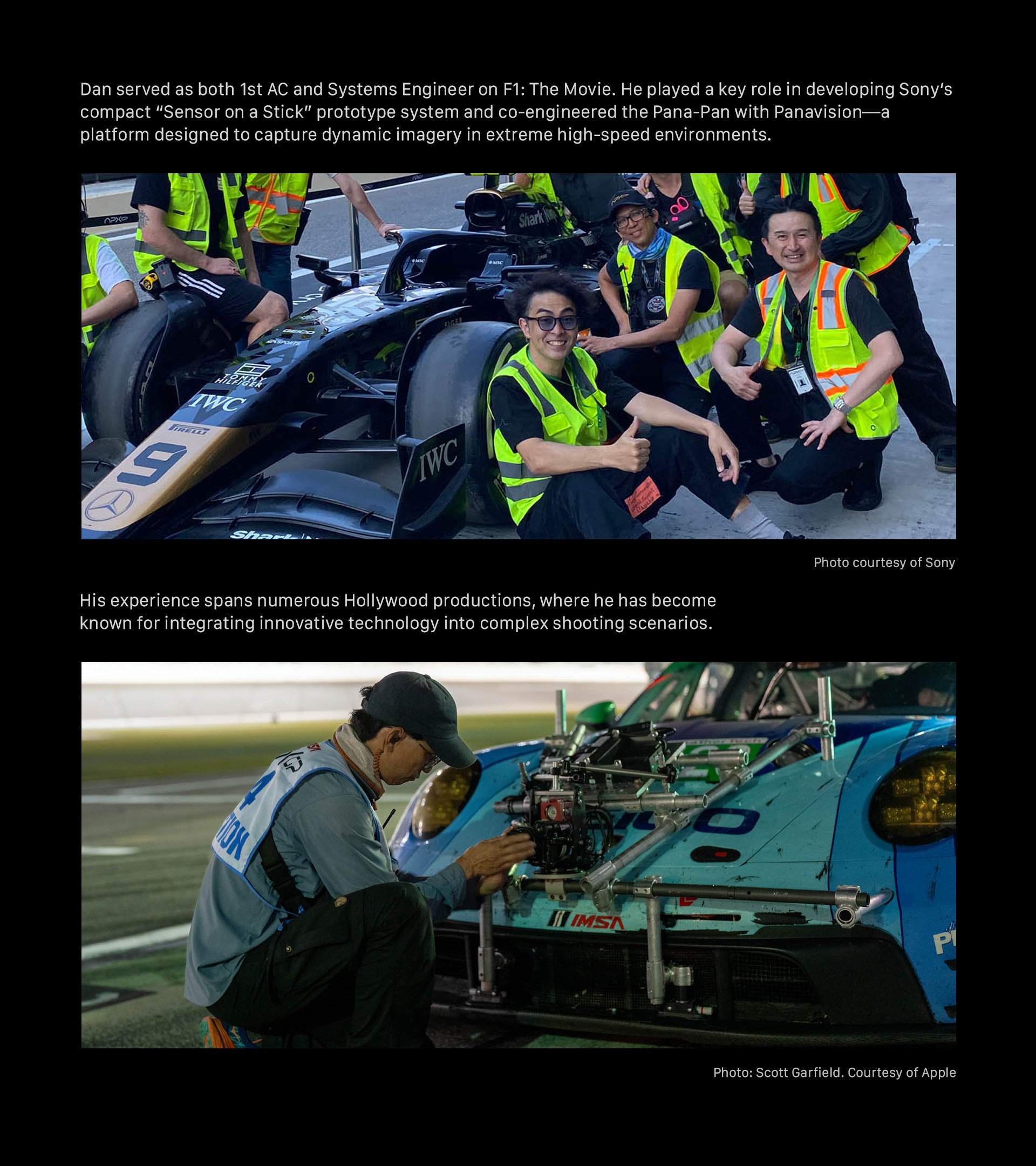Dan Ming trabajó como primer asistente de cámara e ingeniero de sistemas en la película F1: The Movie. Desempeñó un papel clave en el desarrollo del prototipo de sistema compacto «Sensor on a Stick» de Sony y colaboró con Panavision en el desarrollo del sistema Pana-Pan.