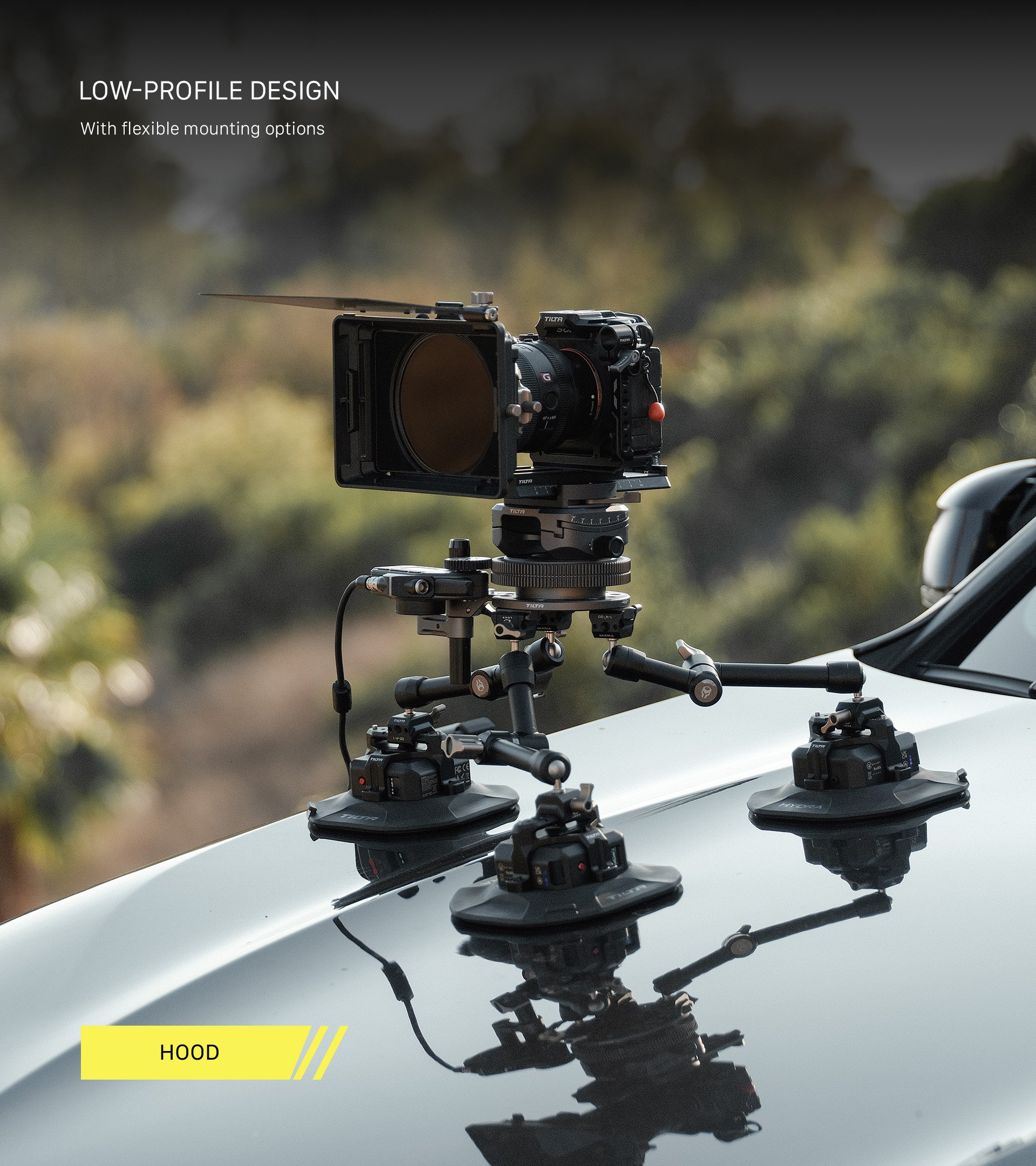 Este sistema está diseñado para ayudar a capturar la acción a alta velocidad típica de las tomas de coche a coche, pero también se puede utilizar en otros escenarios creativos de rodaje gracias a varios puntos de fijación en la propia unidad, como roscas NATO y de ¼”-20.
