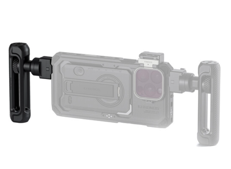 El mango ajustable Tilta TK-AH-B Khronos es un mango lateral universal para la jaula Tilta Khronos que ofrece un ajuste de altura de 5,3 cm, una rotación de 180° en cinco posiciones y roscas de montaje de 1/4"-20 para accesorios. Su cómoda empuñadura de silicona garantiza un agarre seguro para los rigs manuales de iPhone.