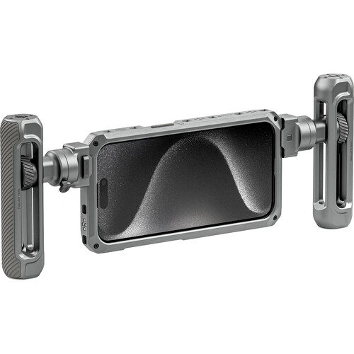 El kit ligero Tilta Khronos para iPhone 15 Pro, en color blanco titanio, está diseñado para la filmación móvil e incluye componentes básicos como la funda Khronos para iPhone 15 Pro y una empuñadura ajustable. Este kit se integra a la perfección en el ecosistema de accesorios Khronos y garantiza la seguridad de tu iPhone gracias a una carcasa resistente con 4 tornillos y abrazaderas de sujeción. Ofrece nueve puntos de montaje y contactos electrónicos para alimentar los accesorios, además de la posibilidad de ajustar la altura y girar 180°. Además, incluye roscas de 1/4"-20 en la parte superior e inferior para una fijación versátil de los accesorios y está equipado con un cómodo mango de silicona para un mejor manejo durante la grabación.