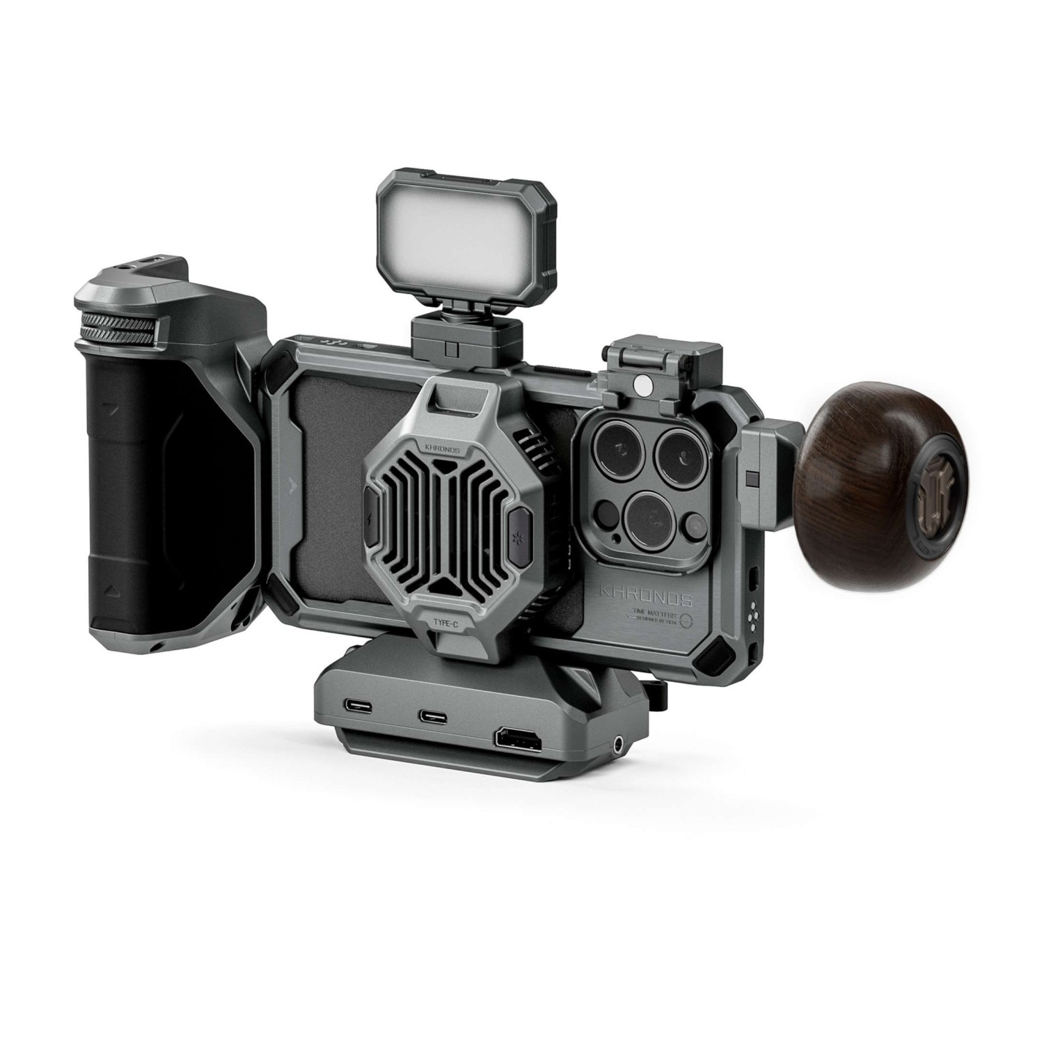 El kit también incluye un sistema de refrigeración para Khronos, equipado con un disipador térmico de 22 W con frecuencia variable. Basta con conectarlo a una fuente de alimentación externa a través de USB-C o utilizar la alimentación de la empuñadura incluida para cargar simultáneamente el iPhone y mantener su temperatura mientras se utiliza la conexión magnética inalámbrica MagSafe.