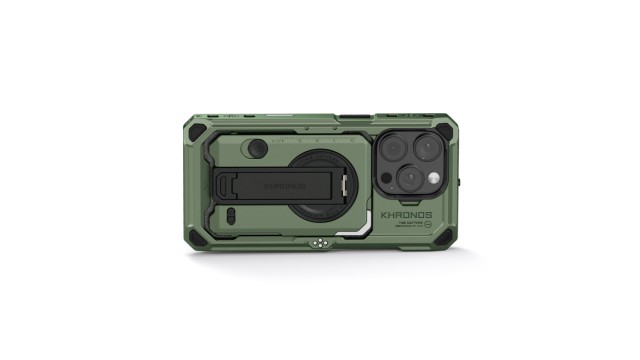 La carcasa Khronos cuenta con puntos de contacto electrónicos integrados en toda su superficie, lo que permite transmitir energía a través de la carcasa para alimentar los accesorios cuando se utiliza la empuñadura de alimentación opcional. Una novedad de la carcasa 16 es la barra táctil para el control de la cámara, que ofrece a los usuarios acceso completo a las funciones de la barra táctil del iPhone 16.