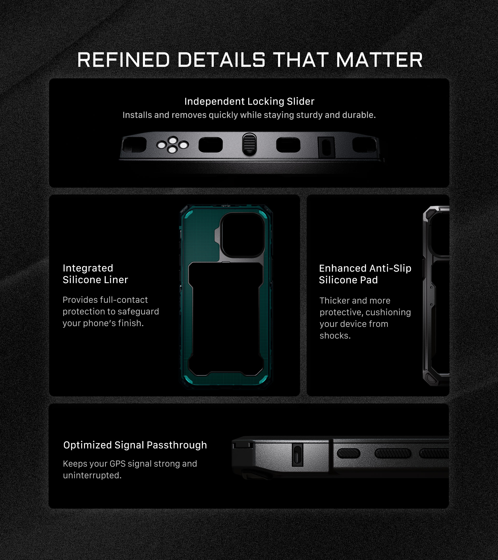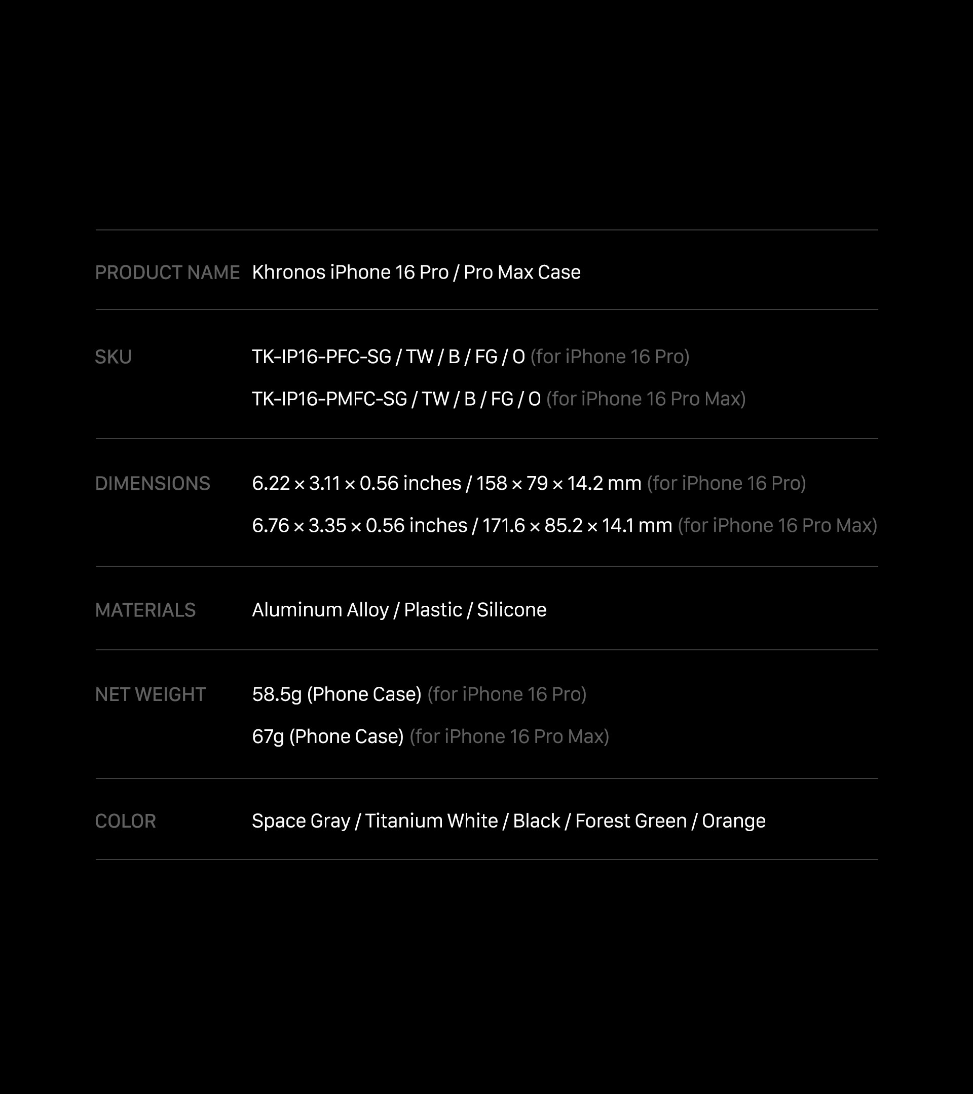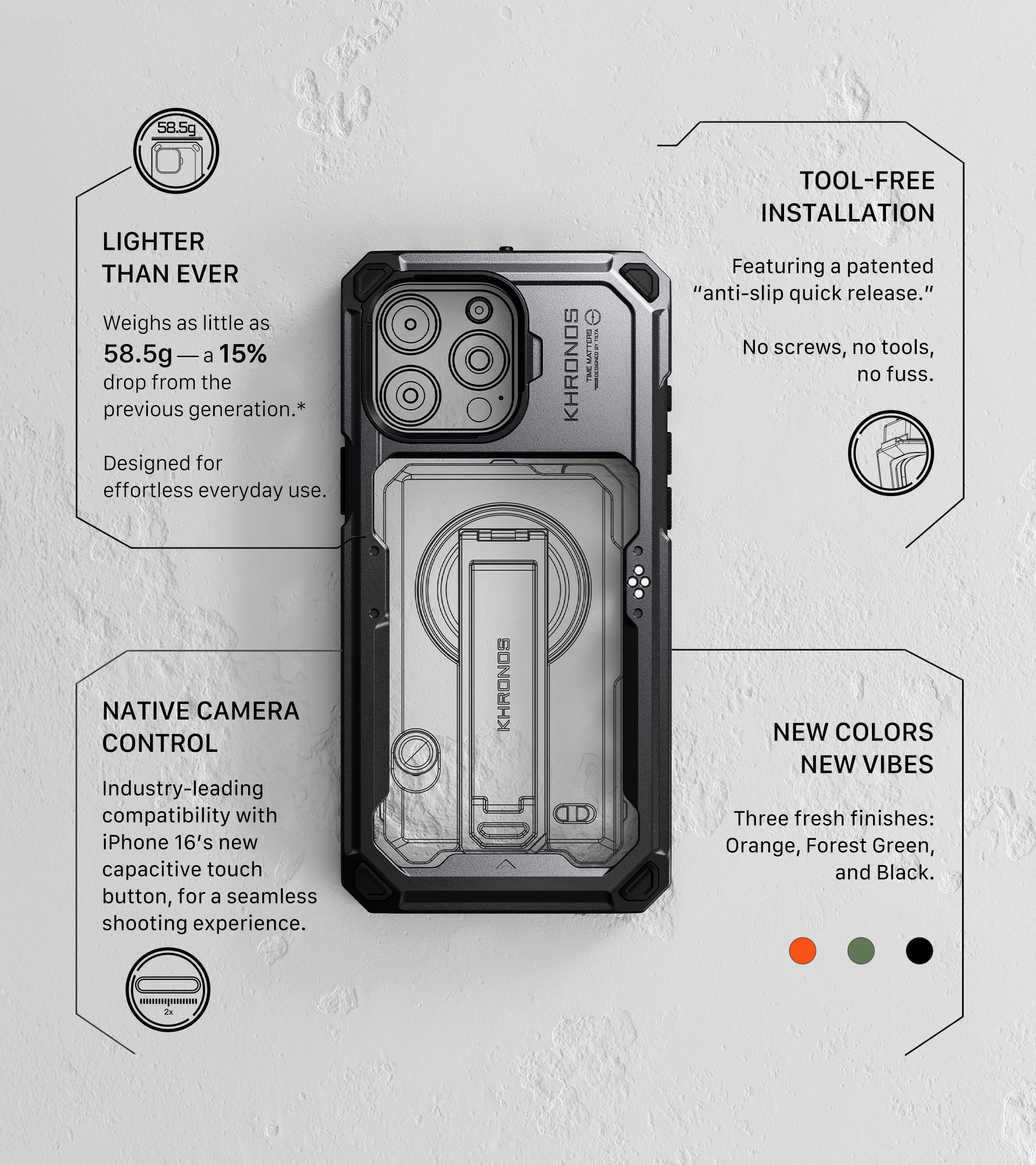 Esta funda para smartphone, inspirada en las jaulas para cámaras y cuidadosamente diseñada para ambos modelos de iPhone 16, ofrece una combinación única de funcionalidad y elegancia. La funda Khronos, creada para proteger tu teléfono del desgaste diario, ofrece una protección fiable sin sacrificar el estilo ni la funcionalidad.