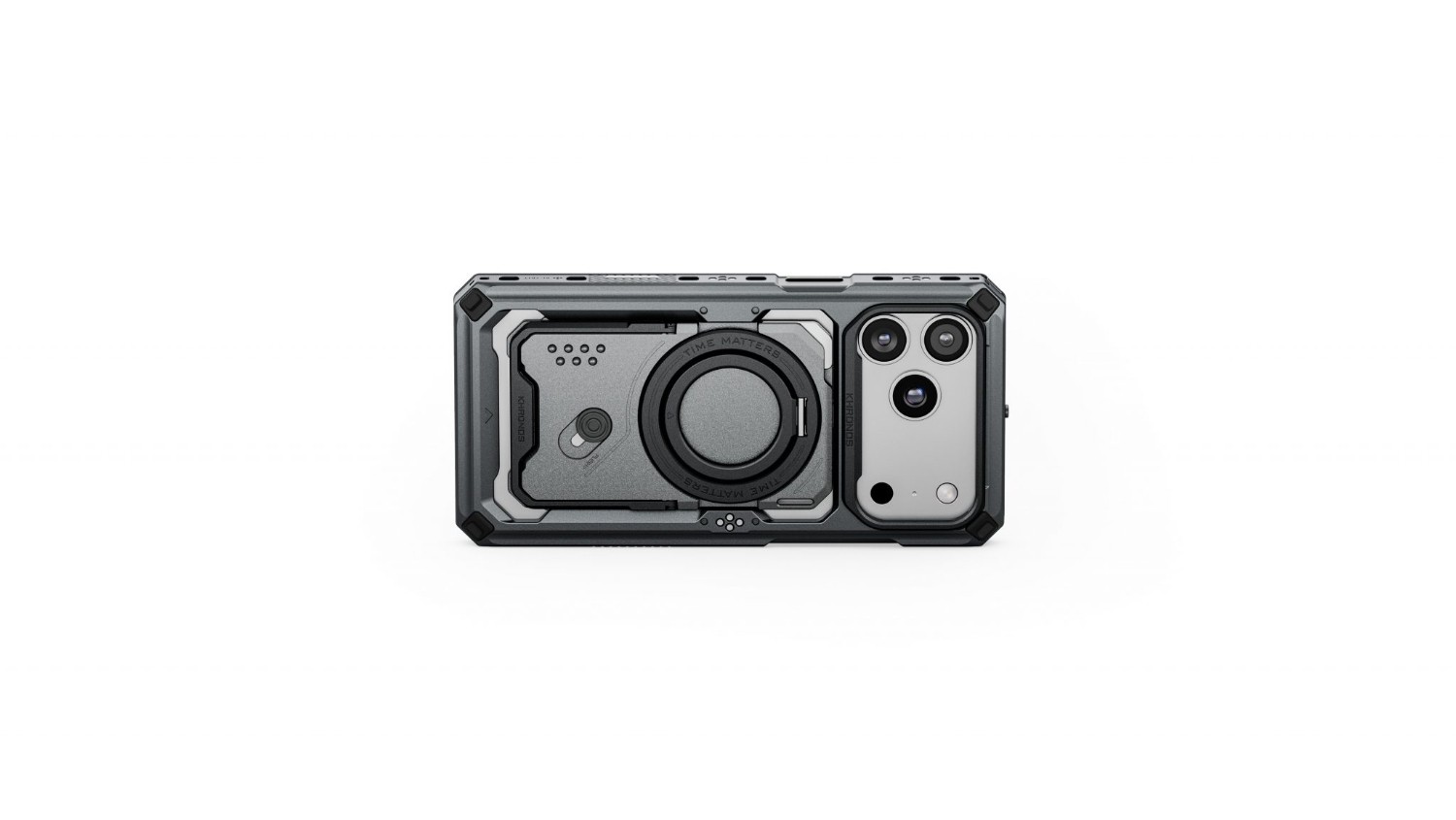 La funda Tilta Khronos para el iPhone 17 Pro en color Space Gray combina una protección resistente con amplias opciones de fijación. Esta funda, diseñada específicamente para el iPhone 17 Pro, ofrece una integración perfecta con accesorios como empuñaduras de enfoque, módulos de refrigeración, filtros y divisores USB-C, todos ellos asegurados mediante un mecanismo de bloqueo y fáciles de montar en trípodes o sistemas de soporte.