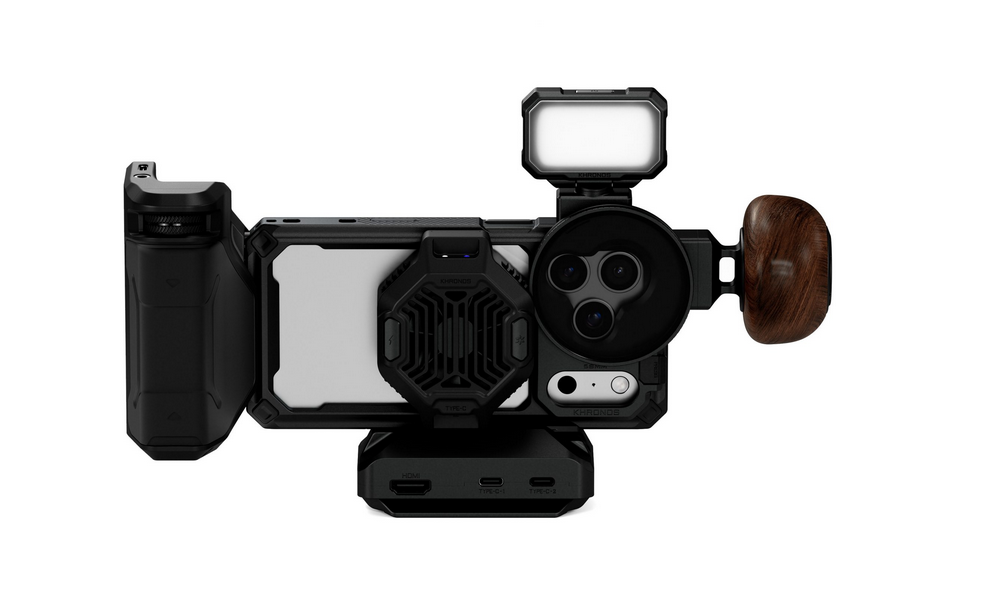 Control de temperatura: El sistema de refrigeración V2 para Khronos es un disipador de 22 W con frecuencia variable que se fija magnéticamente (compatible con MagSafe) y ayuda a reducir el sobrecalentamiento durante largas sesiones de grabación, al tiempo que carga el iPhone de forma inalámbrica.