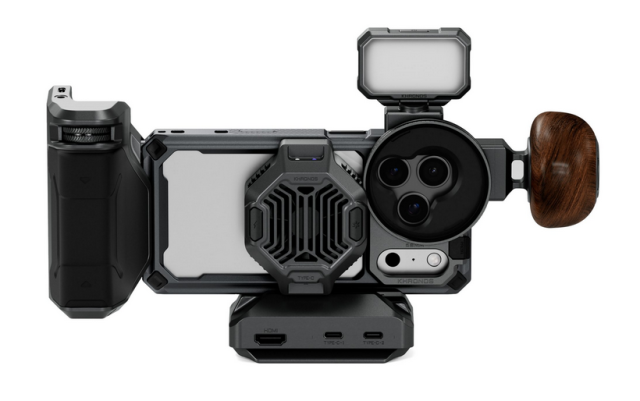 Control de temperatura: El sistema de refrigeración V2 para Khronos es un disipador de 22 W con frecuencia variable que se fija magnéticamente (compatible con MagSafe) y ayuda a reducir el sobrecalentamiento durante largas sesiones de grabación, al tiempo que carga el iPhone de forma inalámbrica.