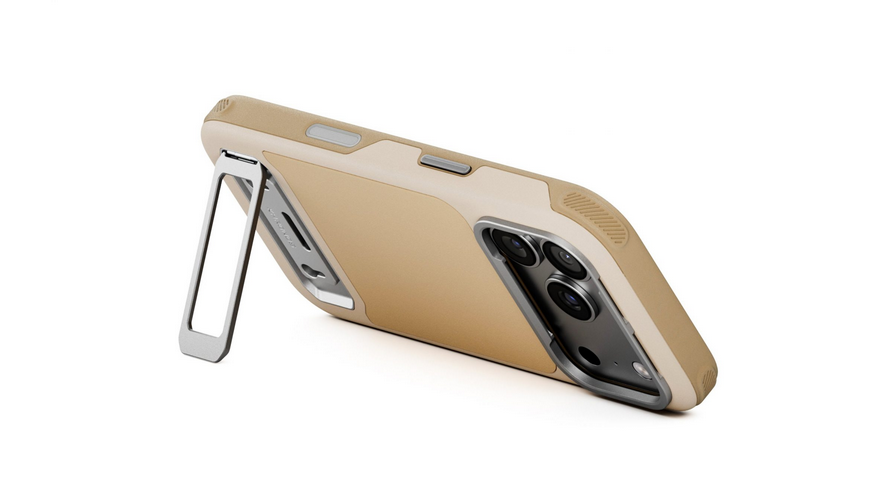 La funda Tilta Khronos Lite para el iPhone 17 Pro (color champán) ofrece un rendimiento profesional en un diseño más ligero. Incluye un soporte integrado vertical y horizontal para visualización, una placa trasera con imanes potentes para fijar rápidamente accesorios (soportes para tarjetas, SSD, luces) y un panel táctil capacitivo para un control preciso de la cámara.