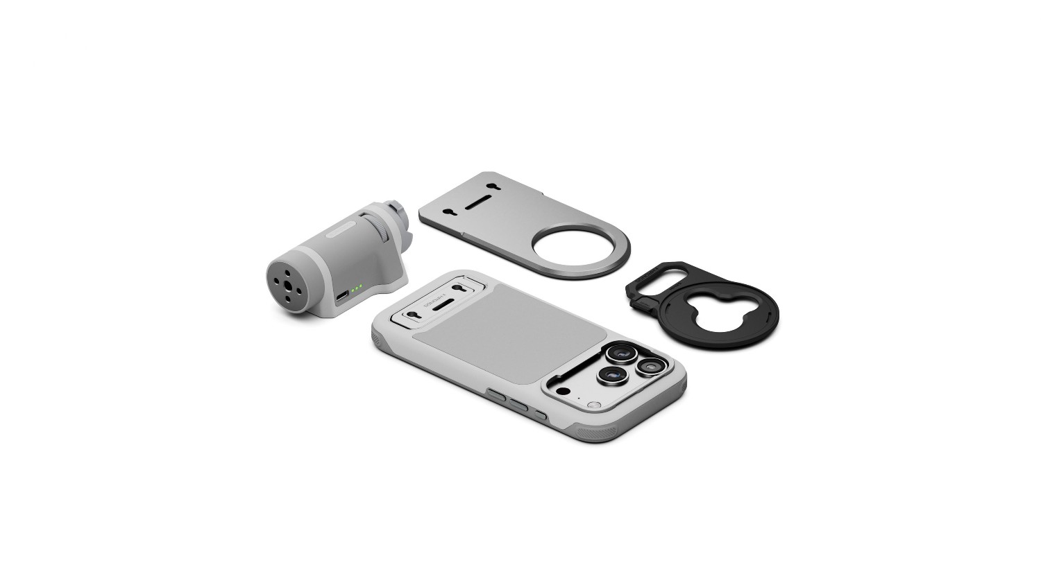 El kit portátil Tilta Khronos Lite, en color gris claro, es un diseño ligero especialmente concebido para el iPhone 17 Pro que ofrece un rendimiento profesional en un formato compacto. Cuenta con un mango ergonómico con control de enfoque y zoom vía Bluetooth, una placa trasera magnética para accesorios y es compatible con filtros de 58 mm de diámetro.