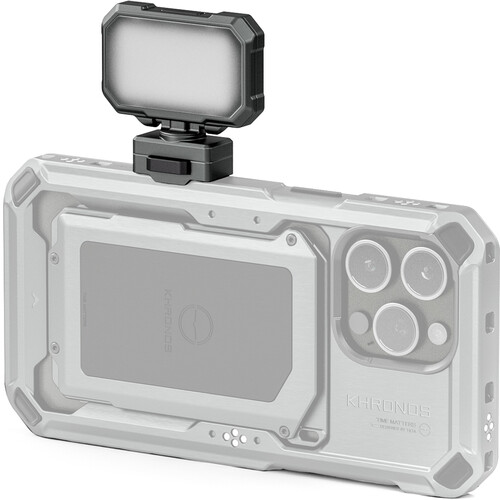 El panel LED en miniatura Tilta Khronos, en color gris espacial, está diseñado para la creación de contenidos, tiene unas dimensiones compactas de 2,6 x 4,4 x 1 pulgada y pesa tan solo 8 onzas. Se conecta fácilmente a las fundas Khronos Pro/Pro Max y ofrece flexibilidad gracias a su inclinación de 30° y su giro horizontal de 350°. El panel ofrece tres niveles de brillo y cuenta con un alto CRI de 95 para una reproducción precisa del color, manteniendo un bajo consumo de energía.