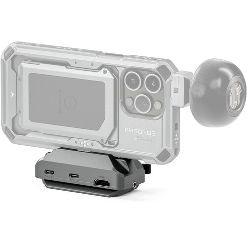 El adaptador USB-C de montaje rápido Tilta Khronos, en color gris espacial, amplía las posibilidades de conexión del iPhone gracias a su integración con dispositivos externos y a su fijación a un trípode o a un soporte cardán. Este versátil divisor cuenta con dos puertos USB-C, un puerto HDMI y una salida de audio de 3,5 mm, todos ellos integrados en una placa de fijación rápida ARCA, lo que permite el uso simultáneo de los puertos USB-C para una conexión y una gestión de la alimentación sin problemas.
