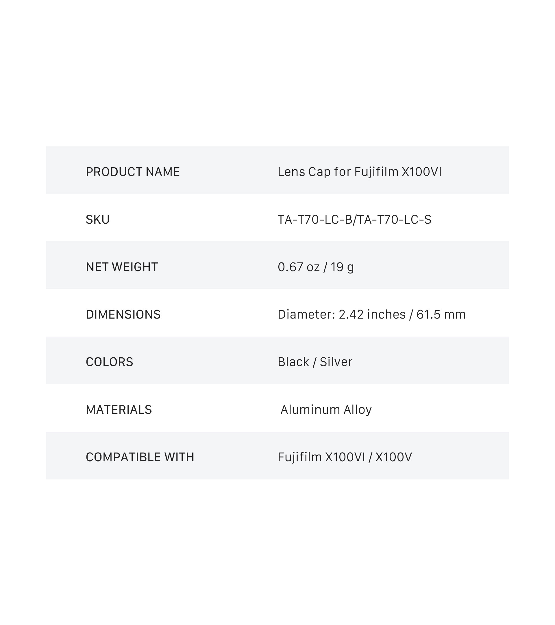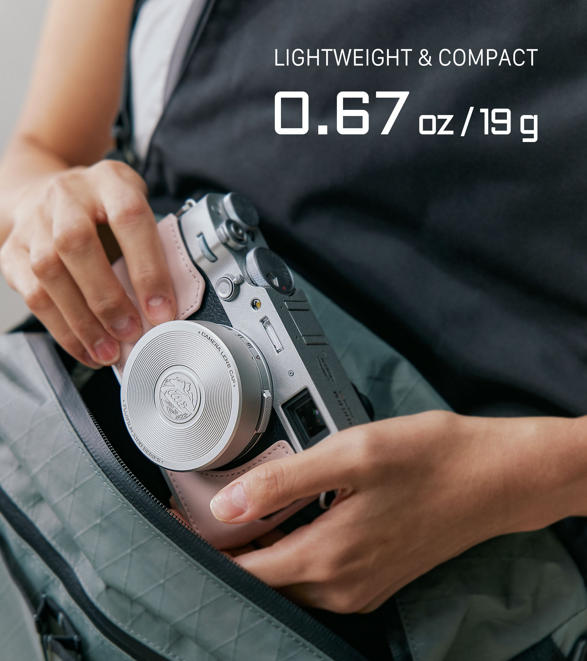 Esta tapa, ligera pero resistente, pesa solo 0,67 oz (19 g) y está diseñada para encajar perfectamente en el objetivo de tu cámara y protegerlo.