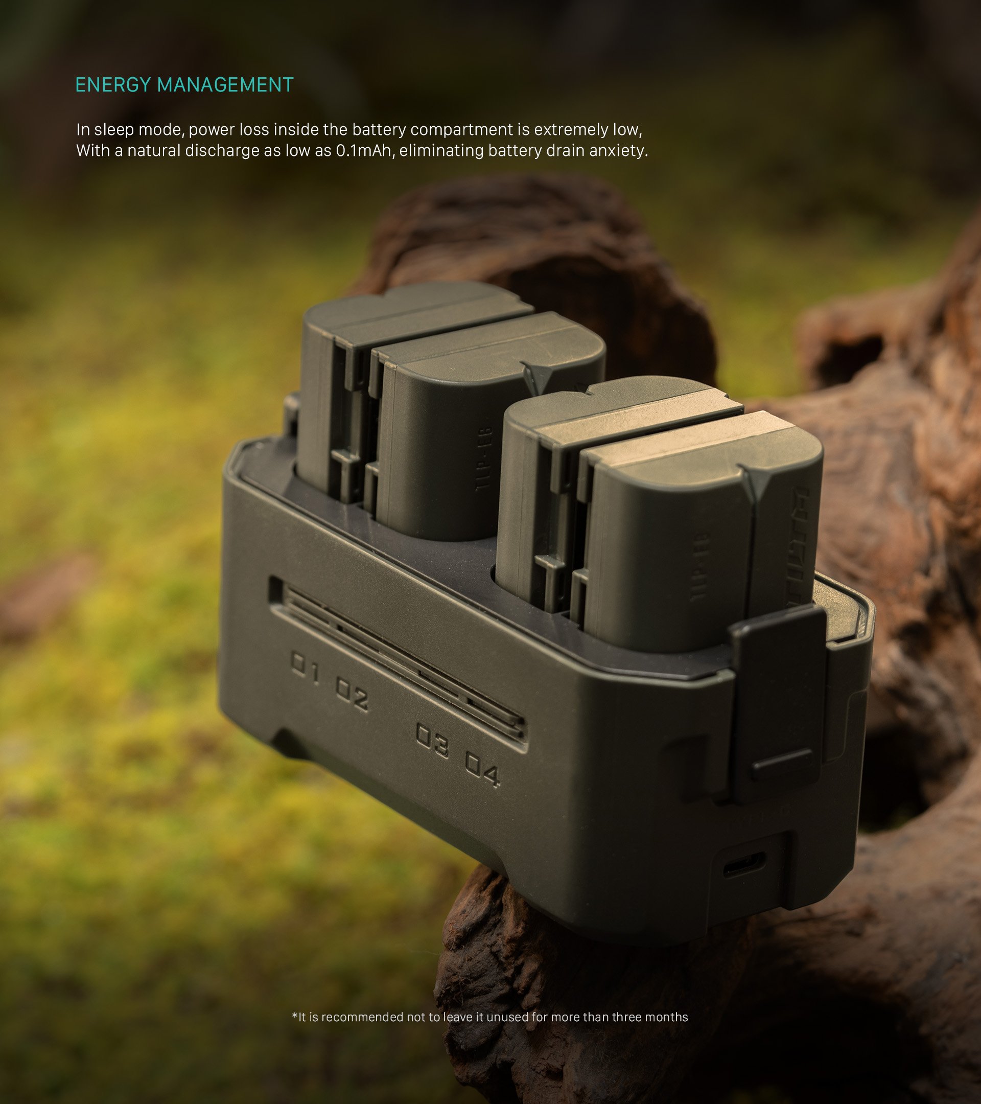 Esta compacta estación de carga está diseñada para admitir baterías LP-E6 de Canon y de otros fabricantes, y ofrece cuatro ranuras para una carga sencilla y un almacenamiento cómodo.