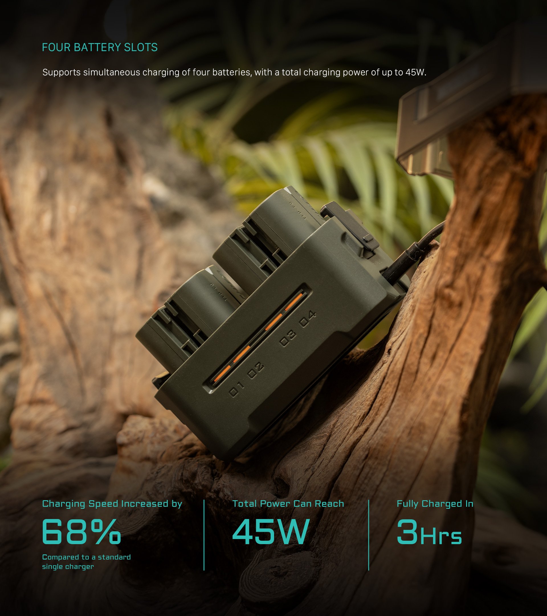 Esta estación de carga compacta está diseñada para baterías LP-E6 de Canon y de otros fabricantes, y cuenta con cuatro ranuras que facilitan la carga y permiten un almacenamiento cómodo. Está equipada con carga rápida PD de 45 W y ofrece una velocidad de carga un 68 % superior a la de un cargador estándar básico, por lo que tus baterías estarán listas para la acción en tan solo 3 horas.