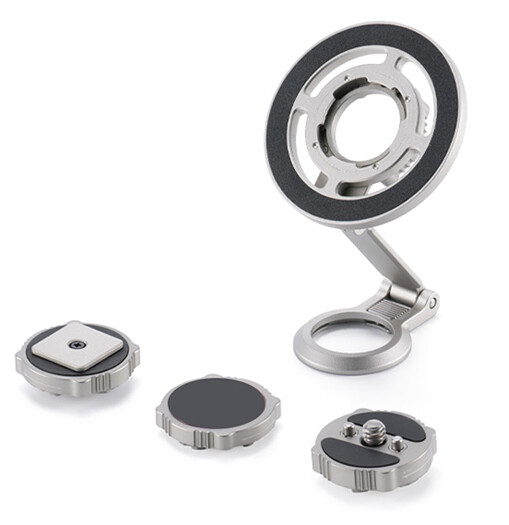 El kit de montaje articulado magnético de Tilt (gris titanio) ofrece una solución universal para el montaje con ajuste continuo en dos ejes y un soporte magnético compatible con MagSafe. El kit está diseñado para smartphones y fundas e incluye un brazo articulado y tres bases intercambiables —flash frío, rosca de 1/4"-20 y almohadilla adhesiva— que permiten un montaje flexible en diversas configuraciones.
