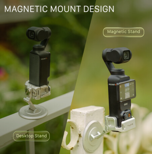 El soporte de montaje magnético Tilta TA-T65-MMS-TW (blanco titanio) es un elegante brazo de aluminio ultracompacto con doble articulación, diseñado exclusivamente para la DJI Osmo Pocket 3. Combina una fijación magnética instantánea con una base estándar con rosca de 1/4"-20 y ofrece una inclinación de la parte superior de 270° y una rotación de la parte inferior de 180°, lo que permite ángulos creativos ilimitados en configuraciones de mesa, bajas o montadas.