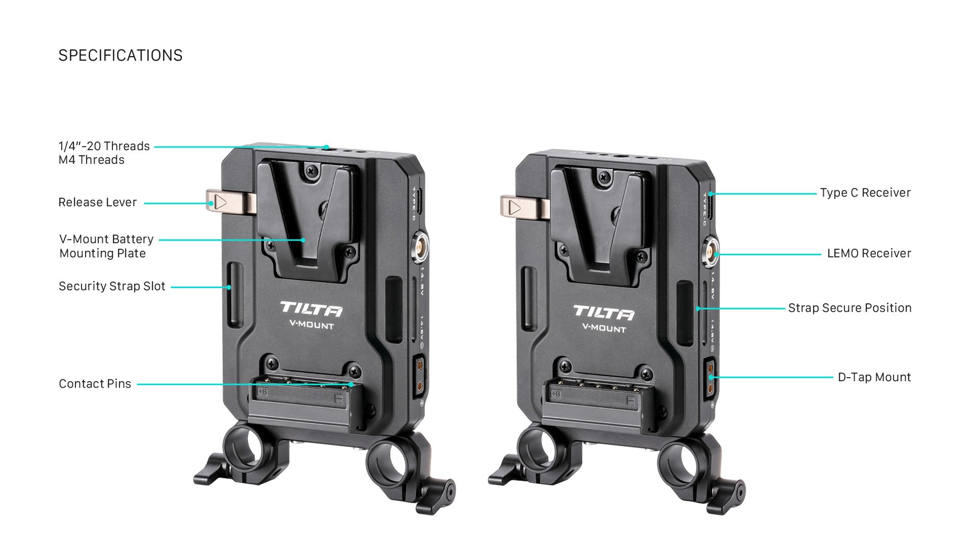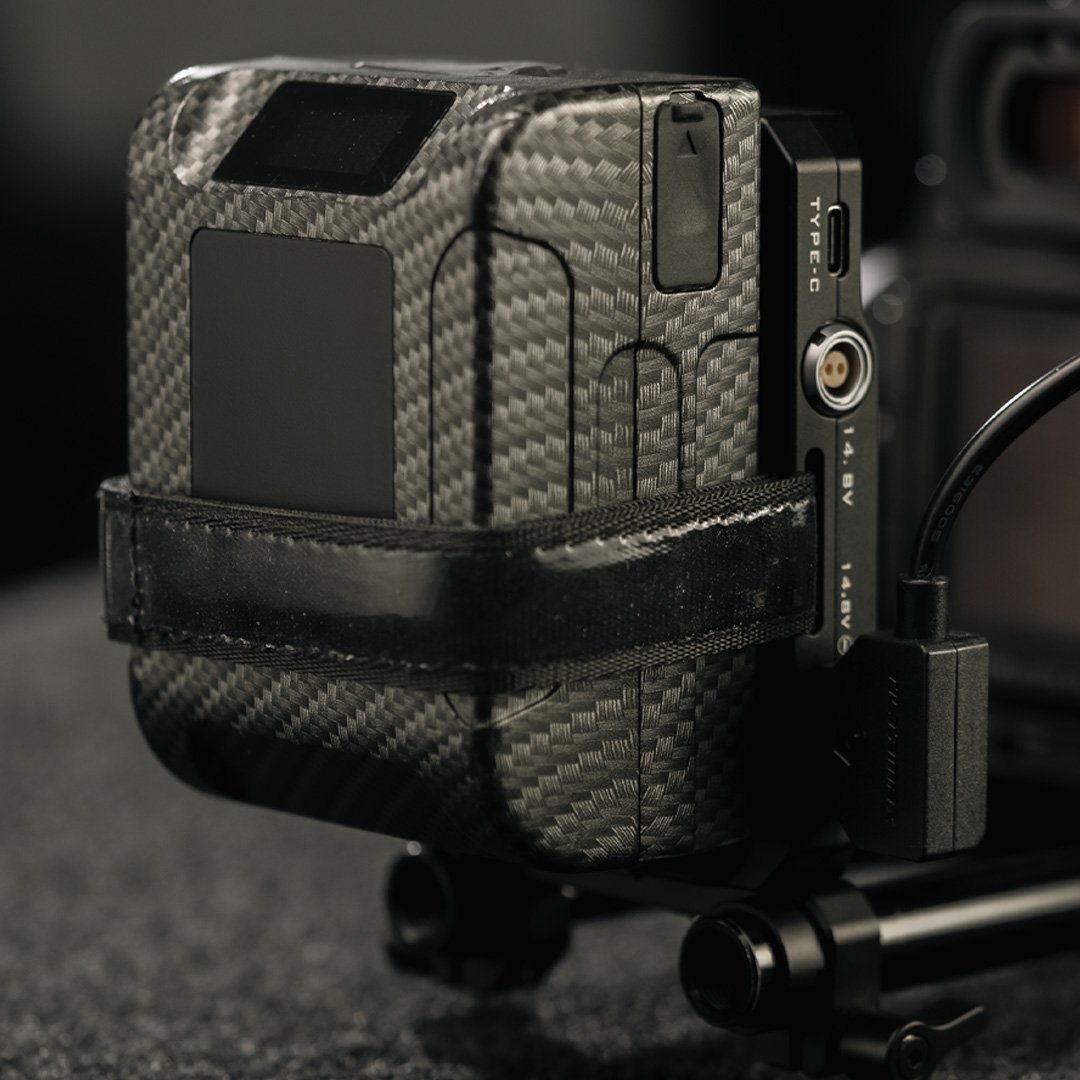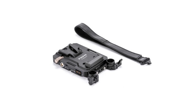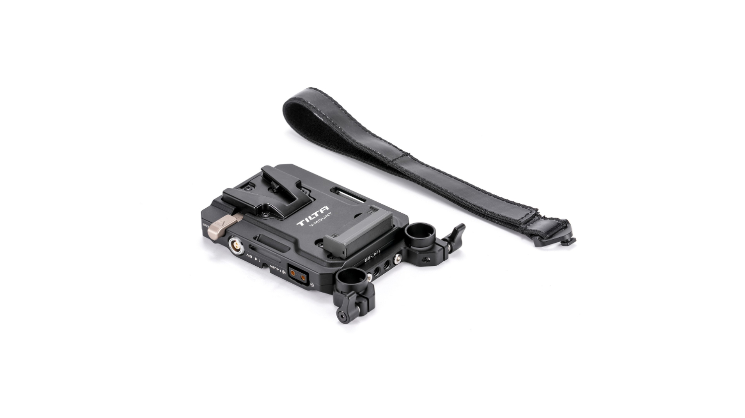 Una característica única de esta placa son las ranuras integradas para la correa, que permiten a los usuarios acoplar la correa de seguridad incluida a la batería V-Mount.