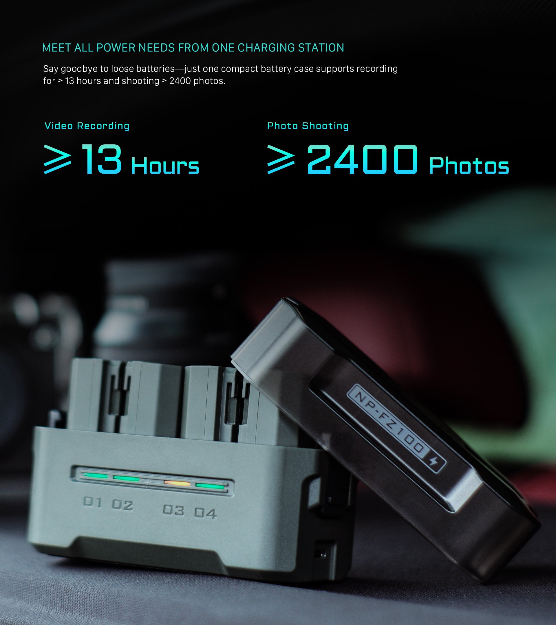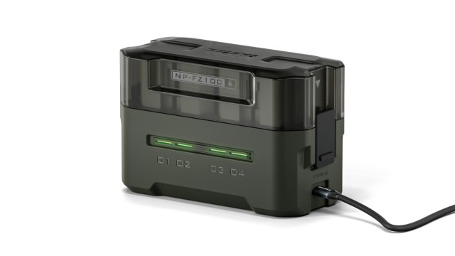 Gracias a la posibilidad de cargar completamente cuatro baterías NP-FZ100, los usuarios estarán preparados para hasta 13 horas de grabación de vídeo o tendrán energía suficiente para procesar 2400 fotografías, lo que resulta ideal para sesiones fotográficas prolongadas.