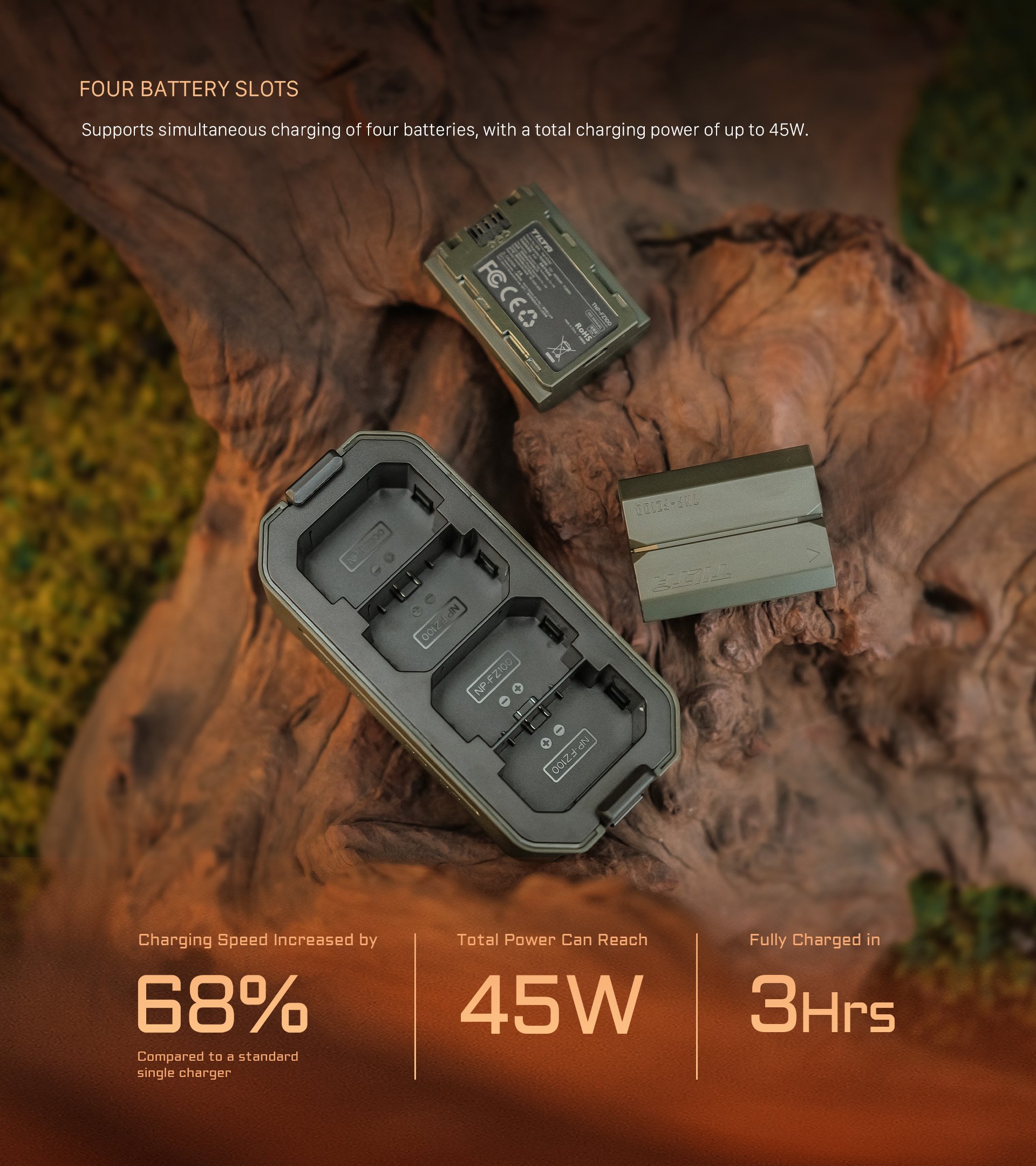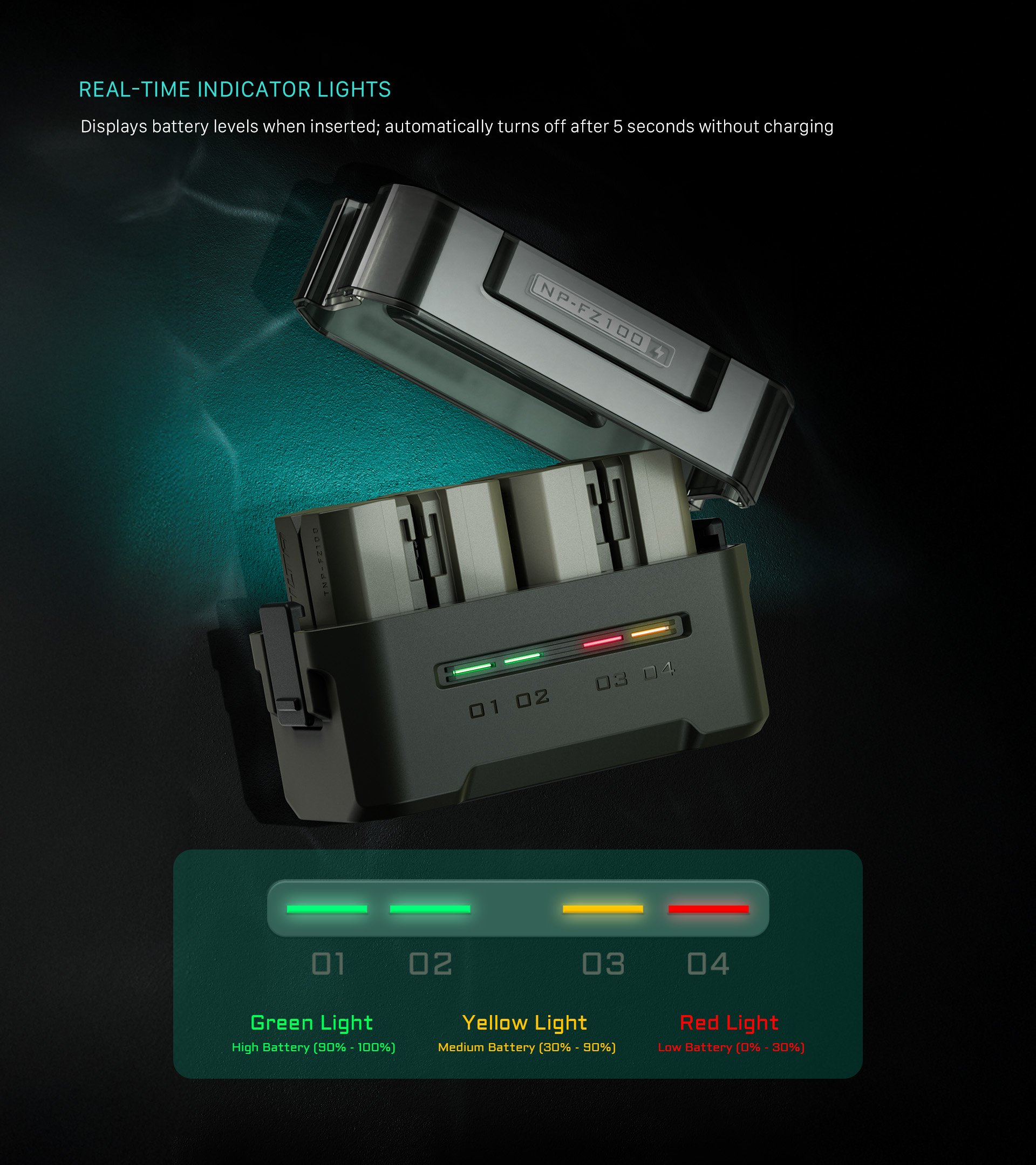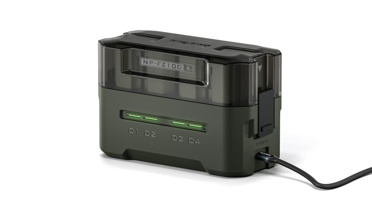 Esta compacta estación de carga está diseñada para admitir baterías NP-FZ100 de Sony y otros fabricantes, y ofrece cuatro ranuras para una carga sencilla y un almacenamiento cómodo.