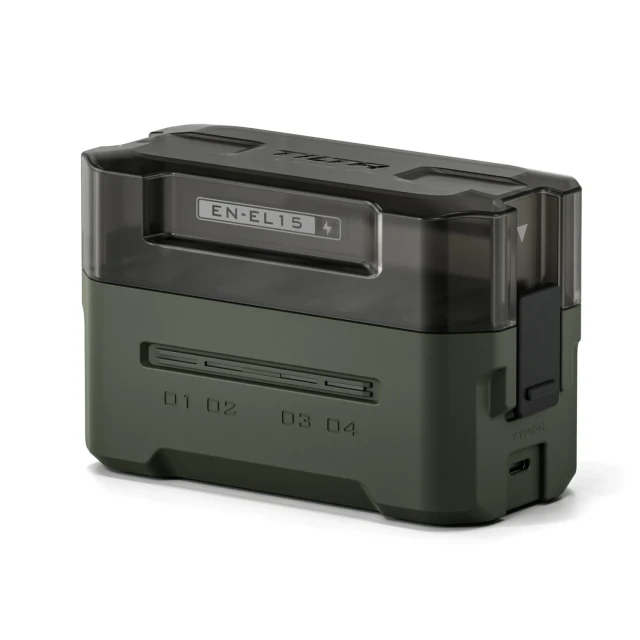 Esta compacta estación de carga está diseñada para admitir baterías EN-EL15C de Nikon y otros fabricantes, y ofrece cuatro ranuras para una carga sencilla y un almacenamiento cómodo.