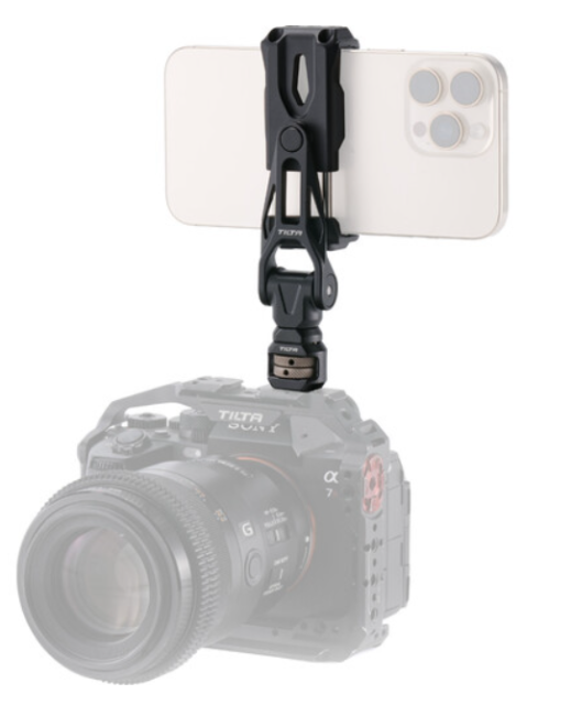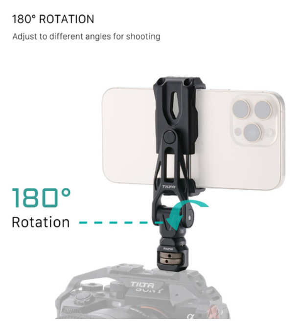 El TA-PMB5-1420K-B combina la abrazadera giratoria para teléfonos Tilta V2 con el adaptador correspondiente de 1/4"-20 en un solo paquete. La abrazadera de aluminio CNC está equipada con mordazas de silicona suave que sujetan con seguridad teléfonos de 76 a 97 mm de ancho (iPhone 13–16 Pro, Galaxy S23/S24, Pixel 8/9, etc.) y permite un giro continuo de 360° con posiciones de bloqueo precisas para una alineación perfecta en vertical u horizontal. El adaptador incluido se encaja en la base de la pinza mediante dos pasadores de posicionamiento tipo ARRI y ofrece una rosca exterior fija de 1/4"-20 en la parte inferior, lo que garantiza una rotación nula incluso con un uso intensivo. Ligero, sin necesidad de herramientas y totalmente modular: basta con atornillarlo y grabar.
