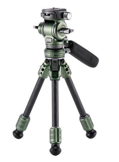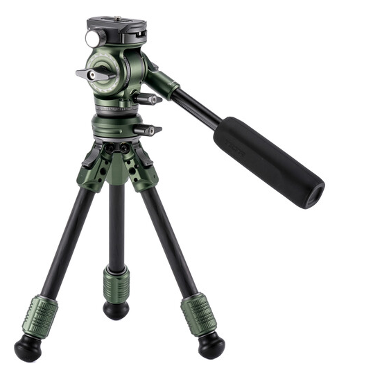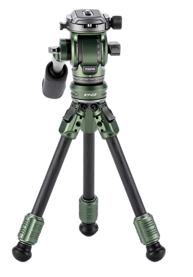 El cabezal de vídeo de mesa Tilta VT03, con patas de trípode de fibra de carbono de un solo tramo en color verde bosque, es un trípode de mesa compacto y portátil diseñado para creadores de contenido y cineastas. Está equipado con un cabezal fluido Arca de 360°, patas ajustables de fibra de carbono con bloqueo giratorio y un mango telescópico que soporta hasta 3 kg y ofrece un posicionamiento preciso y opciones universales de fijación de cámaras y accesorios.