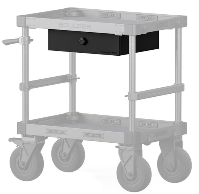 El cajón superior con cerradura Tilta TC-TD-B (negro) es un cajón de aluminio resistente y con cerradura que se monta directamente debajo del estante superior de cualquier carro Boulder Camera Cart y ofrece un espacio de almacenamiento seguro y resistente a la intemperie para objetos de valor, herramientas, baterías o equipos delicados, manteniéndolos ocultos y protegidos en el lugar de rodaje.