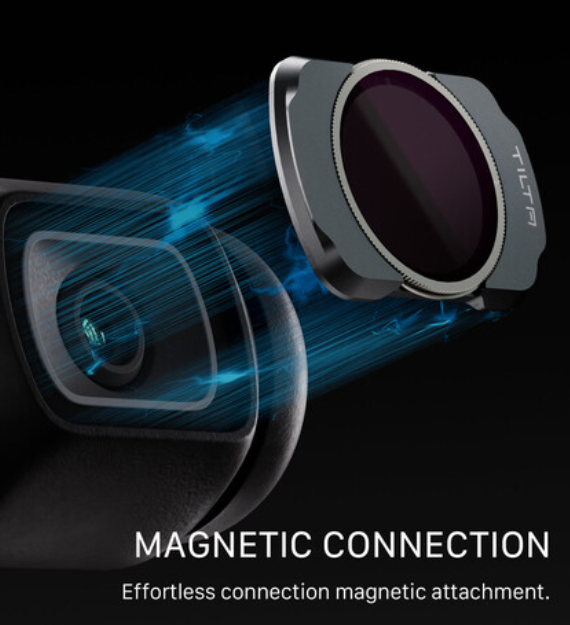 El marco de aluminio, fino y ligero, garantiza que el filtro no afecte a la calibración de la Pocket 3, y su sistema de fijación magnético permite colocar o retirar el filtro de forma rápida y segura. Los bordes superior e inferior estriados proporcionan un mejor agarre para facilitar su extracción.