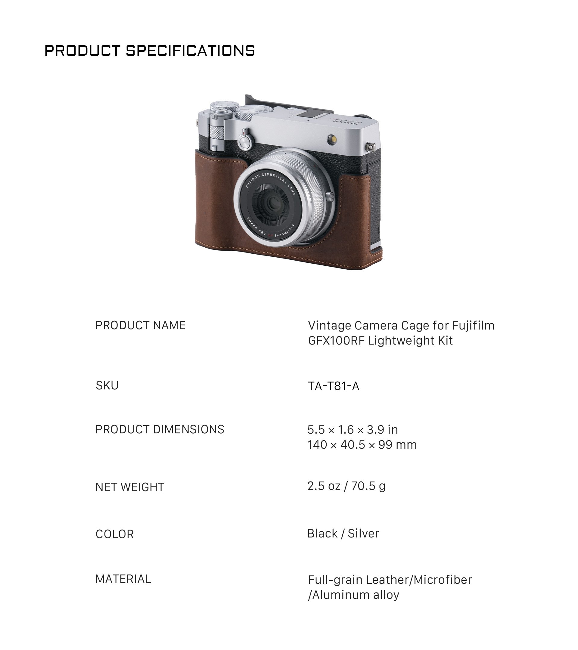 Presentamos el Vintage Camera Cage para el kit ligero de la Fujifilm GFX100RF. Este kit incluye una funda de cuero para la cámara Fujifilm GFX100RF, que se fija mediante un tornillo de 1/4″-20 y ofrece a los usuarios una forma más cómoda de controlar y manejar el cuerpo de la cámara gracias a su asa integrada.