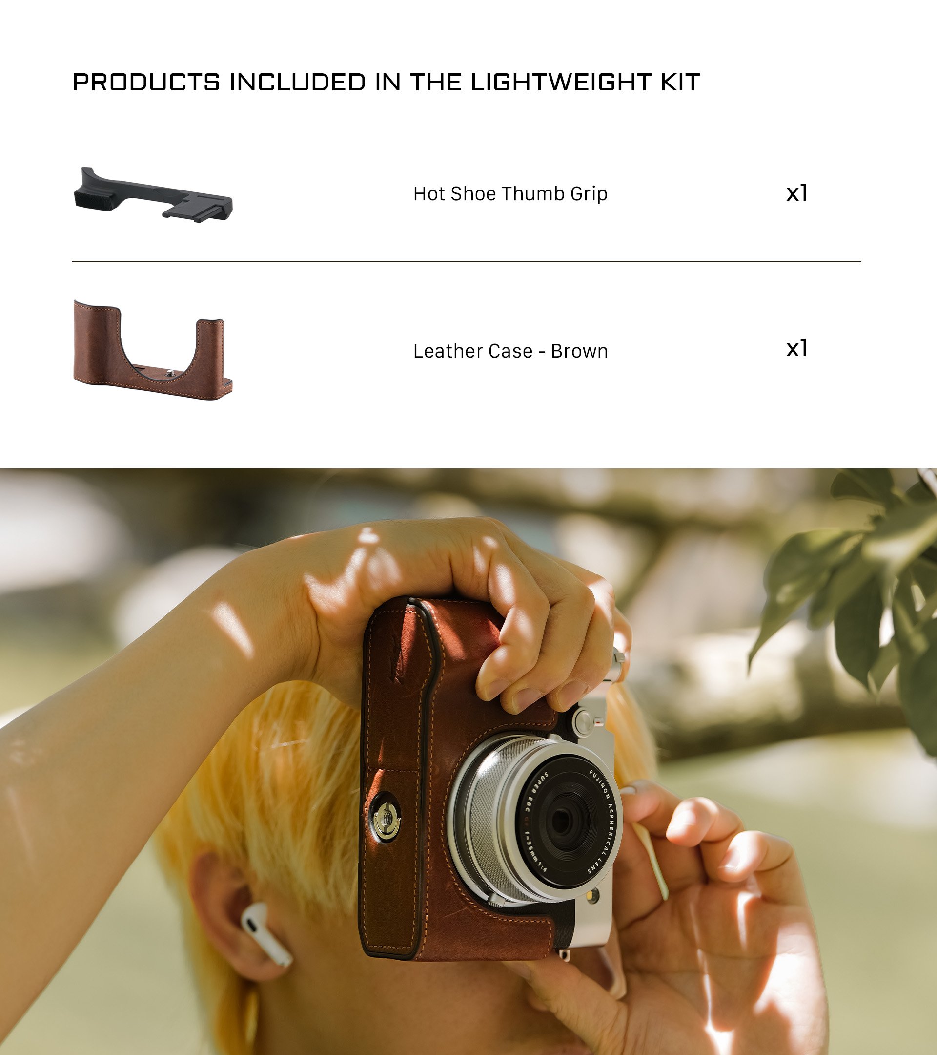 Este kit incluye una funda de cuero para la cámara Fujifilm GFX100RF, que se fija mediante un tornillo de 1/4″-20 y ofrece a los usuarios una forma más cómoda de controlar y manejar el cuerpo de la cámara gracias a su asa integrada.