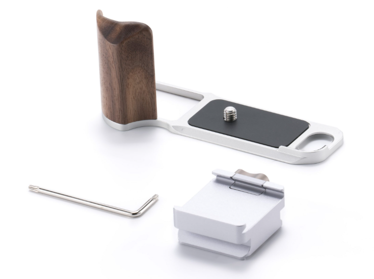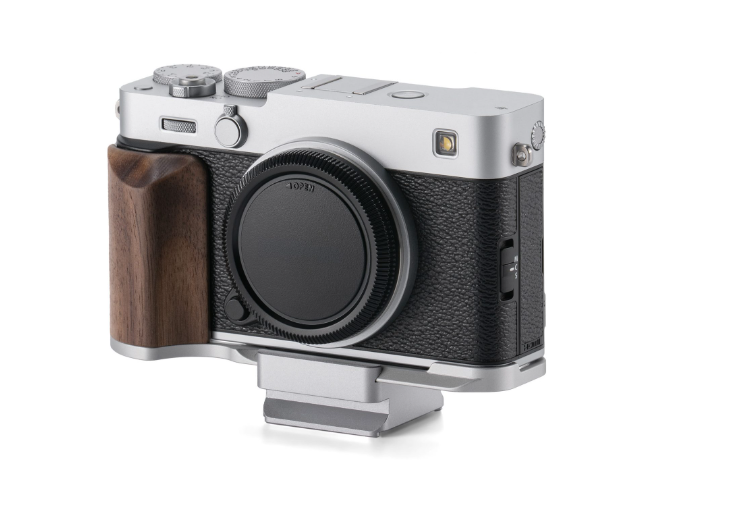 El kit de base para jaula de cámara Tilta TA-T91-A-S Vintage es una ligera consola en forma de L fabricada en aluminio plateado y madera de nogal, con un ergonómico mango de madera, diseñada específicamente para la cámara Fujifilm X-E5. Ofrece mayor comodidad al sujetarla con la mano y es compatible con el sistema de fijación rápida Arca-Swiss para una fijación sencilla a gimbals y trípodes, al tiempo que conserva el aspecto retro y compacto de la cámara.