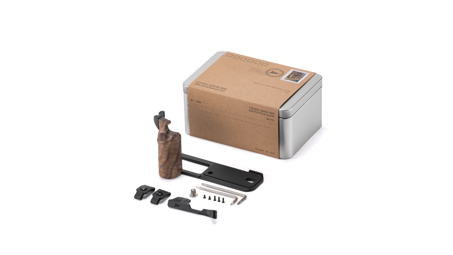 Presentamos el Vintage Camera Cage para el kit básico de la Fujifilm X100VI. Este kit incluye varios accesorios seleccionados que mejoran la funcionalidad de la cámara X100VI, al tiempo que mantienen la agilidad y la portabilidad del sistema. La pieza central de este kit es un soporte en forma de L con un mango de madera de nogal que ofrece un control y un manejo más cómodos de la cámara.