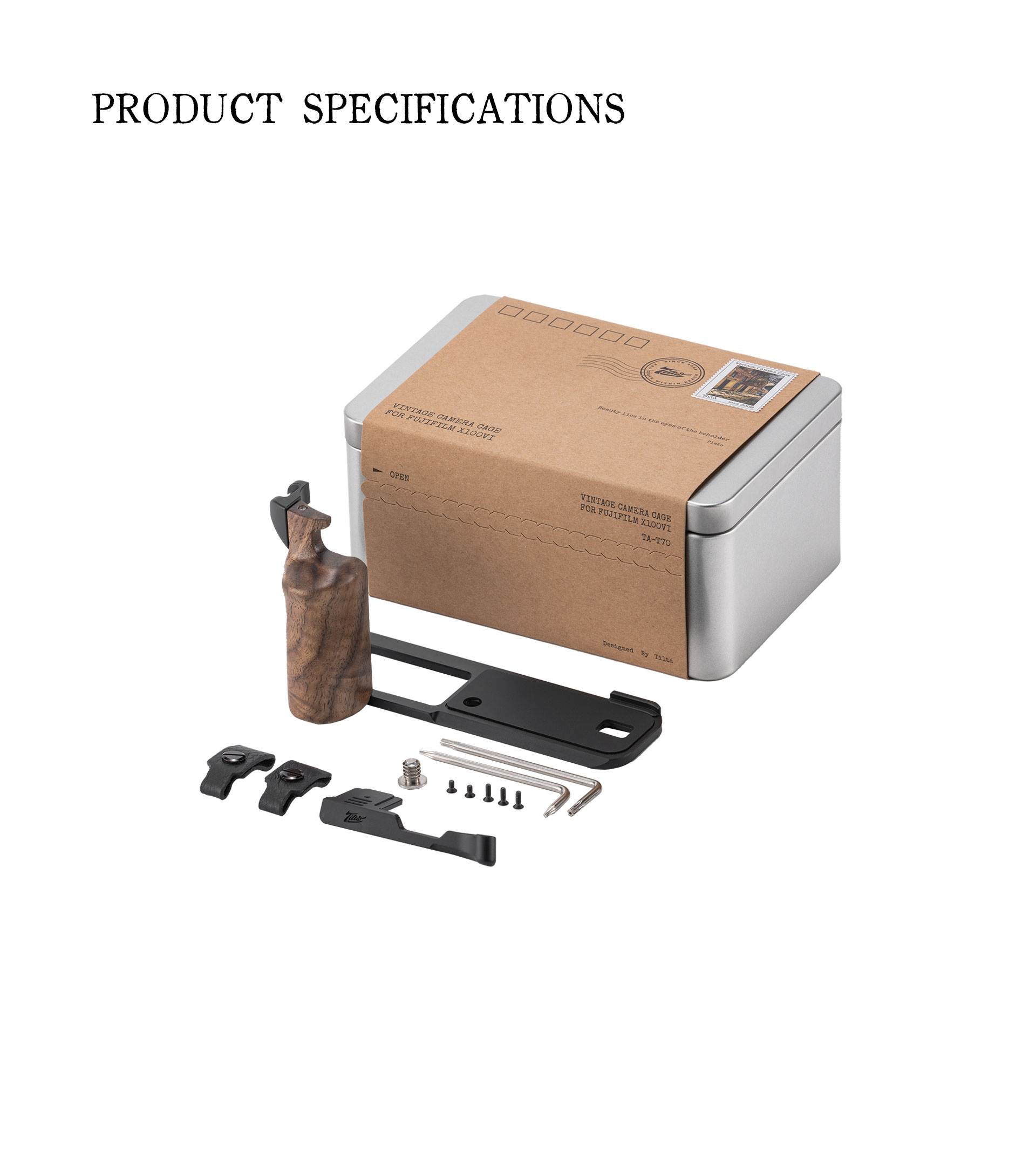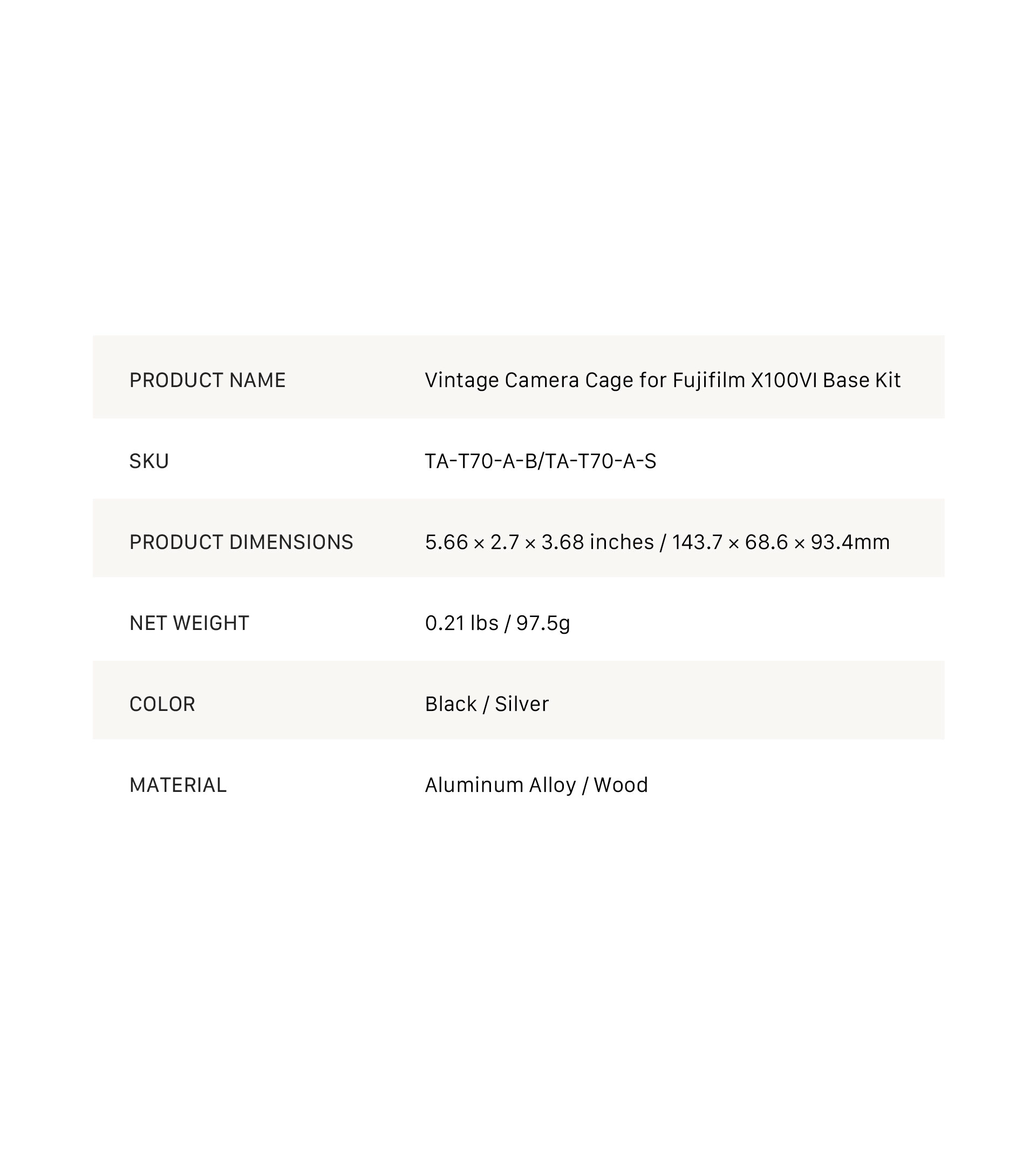 Presentamos el Vintage Camera Cage para el kit básico de la Fujifilm X100VI. Este kit incluye varios accesorios seleccionados que mejoran la funcionalidad de la cámara X100VI, al tiempo que mantienen la agilidad y la portabilidad del sistema. La pieza central de este kit es un soporte en forma de L con un mango de madera de nogal que ofrece un control y un manejo más cómodos de la cámara.