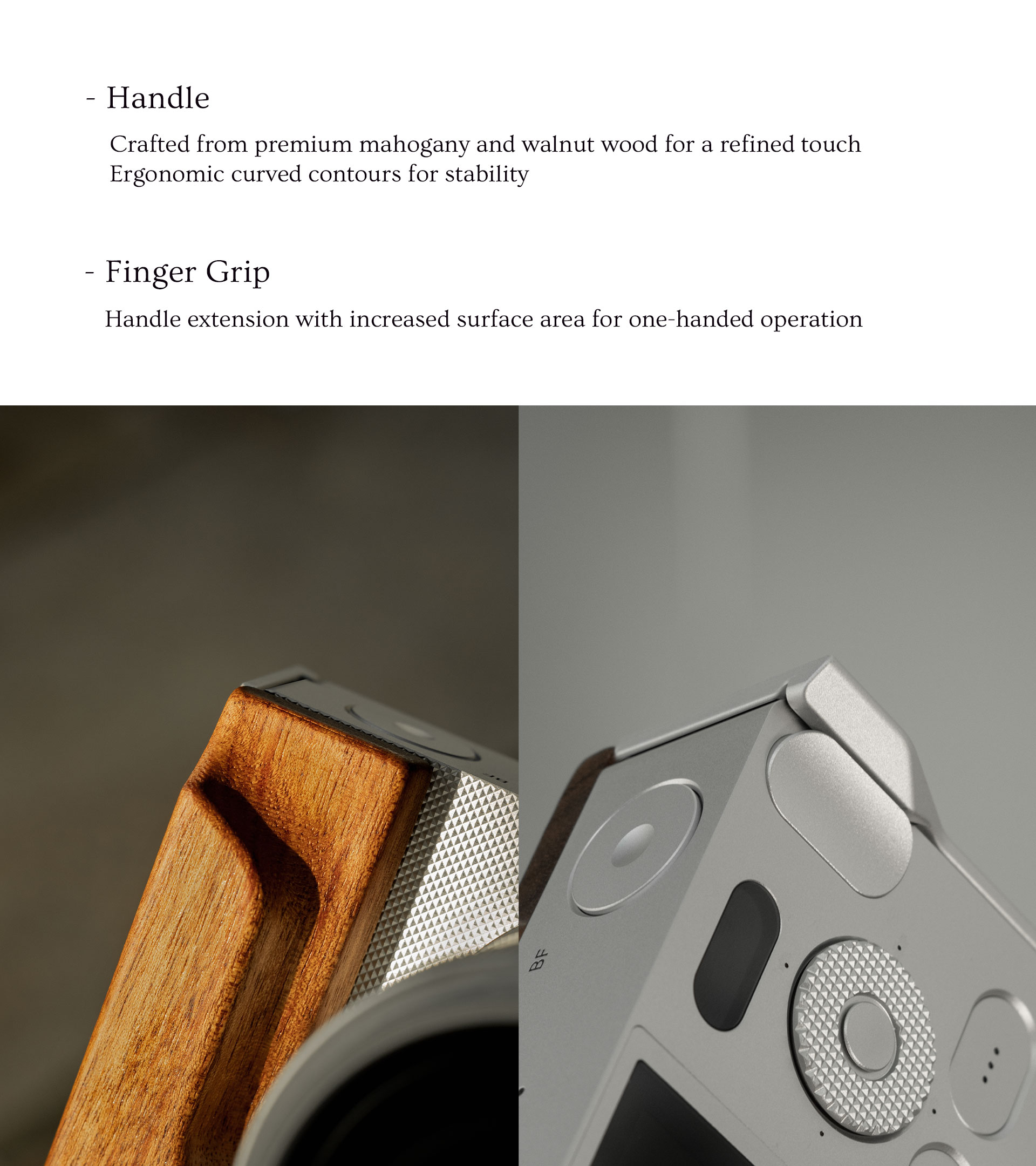 • EMPUÑADURA DE MADERA Garantiza un control y un manejo más cómodos de la cámara