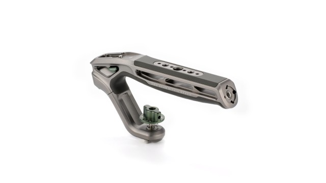 El mango también cuenta con un receptor de zapata fría con pasador de liberación de seguridad, así como con una rosca de posicionamiento estándar Arri.