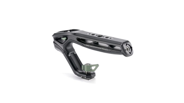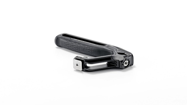 El mango también cuenta con un receptor de zapata fría con pasador de liberación de seguridad, así como con una rosca de posicionamiento estándar Arri.