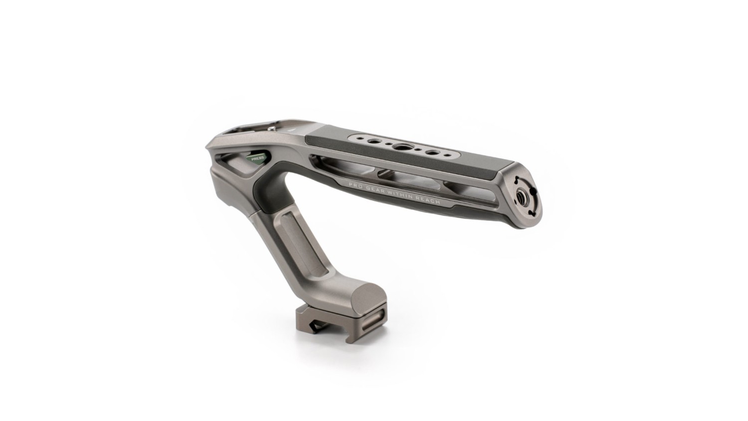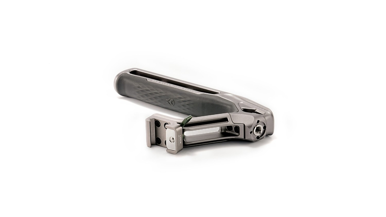 El mango también cuenta con un receptor de zapata fría con pasador de liberación de seguridad, así como con una rosca de posicionamiento estándar Arri.