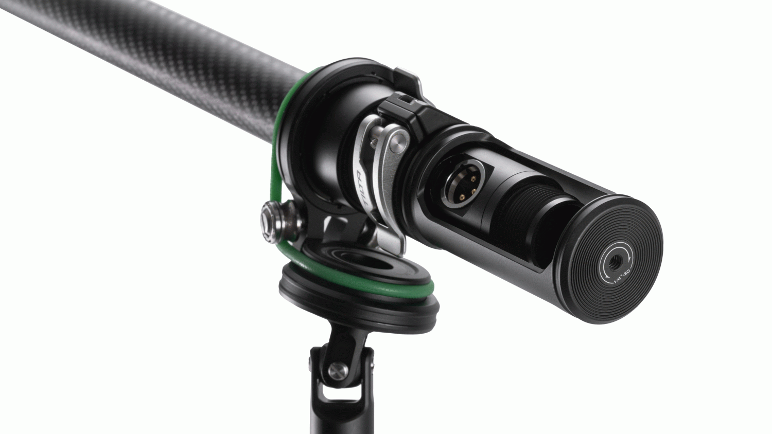 Una parte integral del diseño es el soporte de control, que se fija al extremo posterior del brazo y permite ajustar fácilmente la orientación del micrófono.