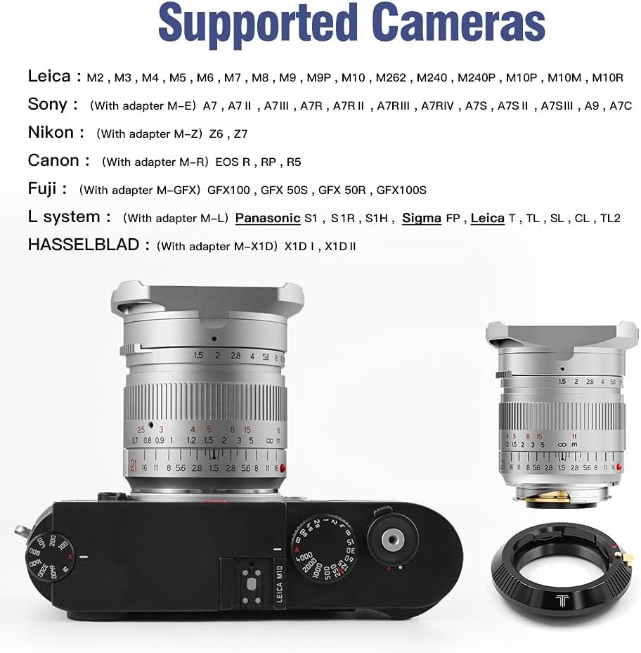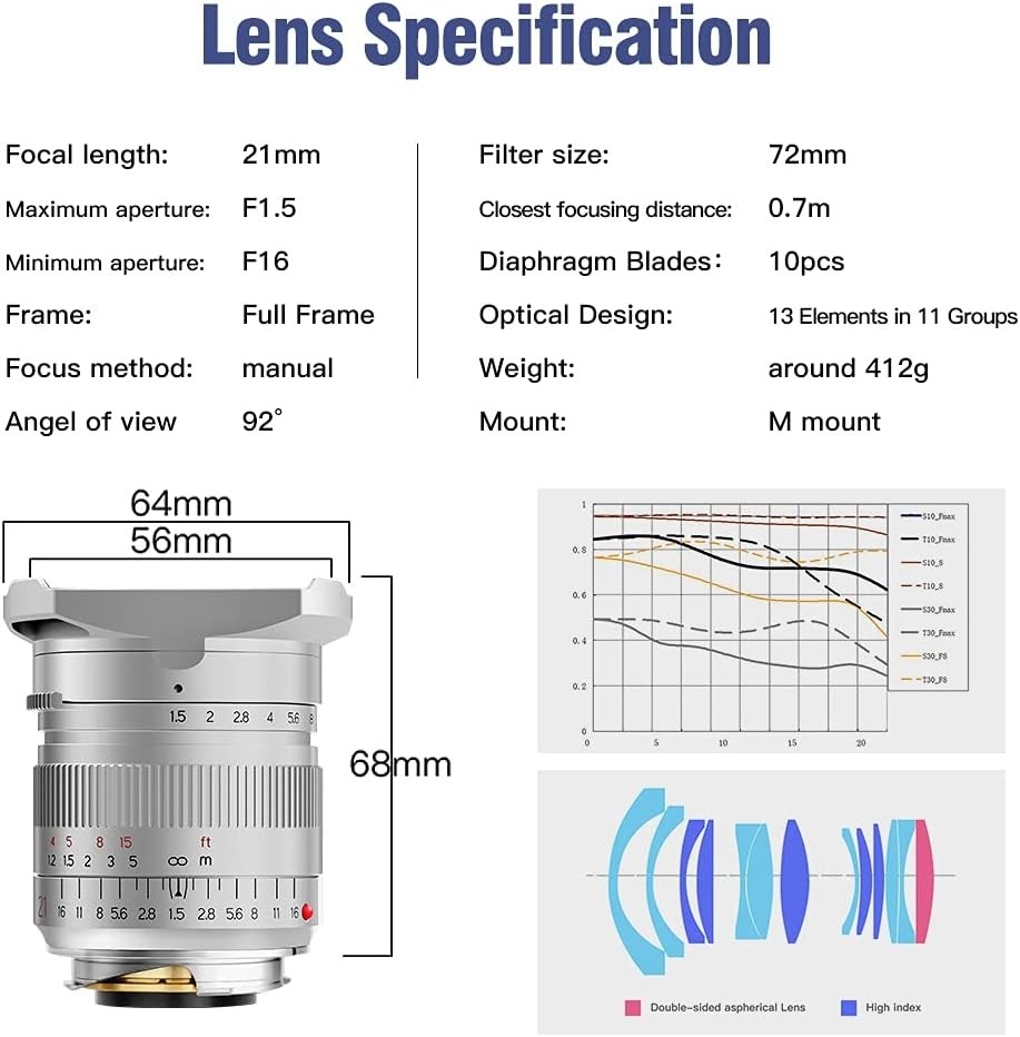El objetivo TTArtisan 21 mm F1,5 es uno de los objetivos gran angulares más pequeños y ligeros para cámaras de formato completo. Su cuerpo totalmente metálico cuenta con 13 elementos en 11 grupos y 10 láminas de diafragma, y pesa entre 422 y 458 g. El paquete incluye un parasol tipo tulipán y un portafiltros redondo (tamaño del filtro: 72 mm), que ayudan a bloquear la luz difusa que causa reflejos y también proporcionan protección física a la parte delantera del objetivo.