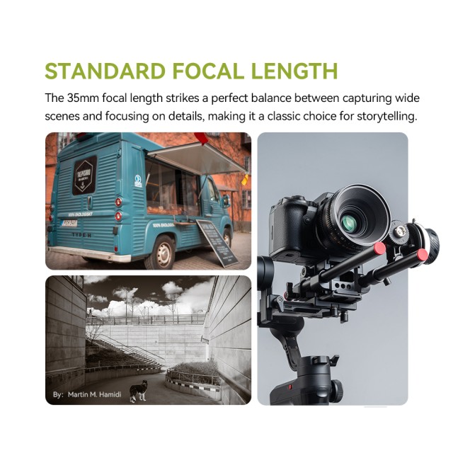 El objetivo TTArtisan 35 mm T2.1 Cine Lens para Nikon Z es un objetivo cinematográfico profesional de formato completo diseñado para cineastas que exigen un rendimiento óptico de primera clase con un control totalmente manual. Con un ángulo de visión de 63°, es ideal para trabajos narrativos, entrevistas, documentales y tomas panorámicas atmosféricas, ya que proporciona una perspectiva natural y una hermosa profundidad de campo.