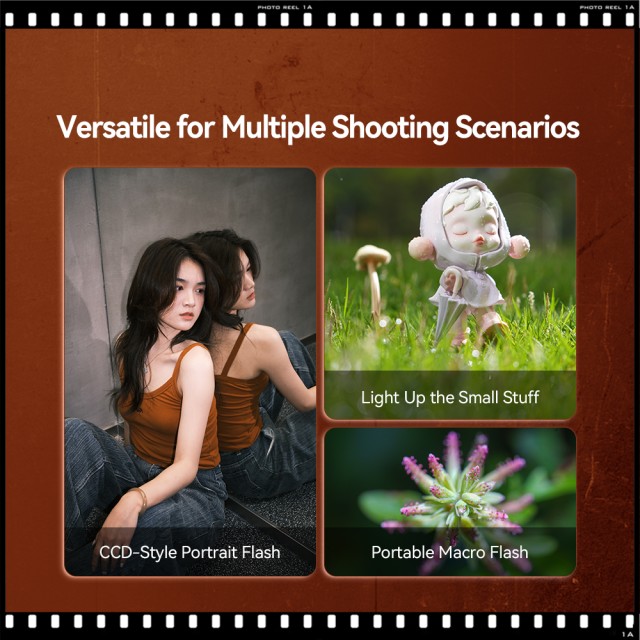 Los retratos tomados con este flash de xenón de 5600 K evocan la atmósfera nostálgica de principios de la década de 2000. No se necesitan filtros: basta con un solo flash para capturar el ambiente y las emociones. Ideal para personajes de anime, juguetes de diseño y bodegones. Este flash compacto pero potente proporciona una luz dura y precisa que revela ricos detalles y crea imágenes con textura. Ya sea en casa o al aire libre, el flash te permite capturar imágenes de alta calidad sin esfuerzo.