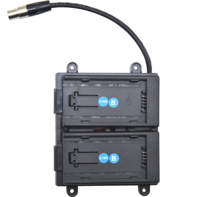 Alimente su monitor F-7H con dos baterías Panasonic AF-100 conectando este soporte para baterías de TVLogic. El soporte Panasonic AF-100 se fija a la parte trasera del monitor F-7H y se conecta al puerto de alimentación XLR mini de cuatro pines del monitor. Proporciona una alimentación de 12 VCC, 3 A.