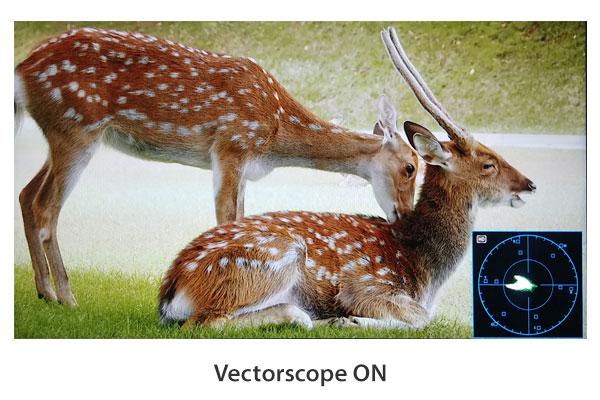 Gama vectorial: Muestra los componentes de color «B-Y» y «R-Y» de las señales de entrada en el eje X-Y.