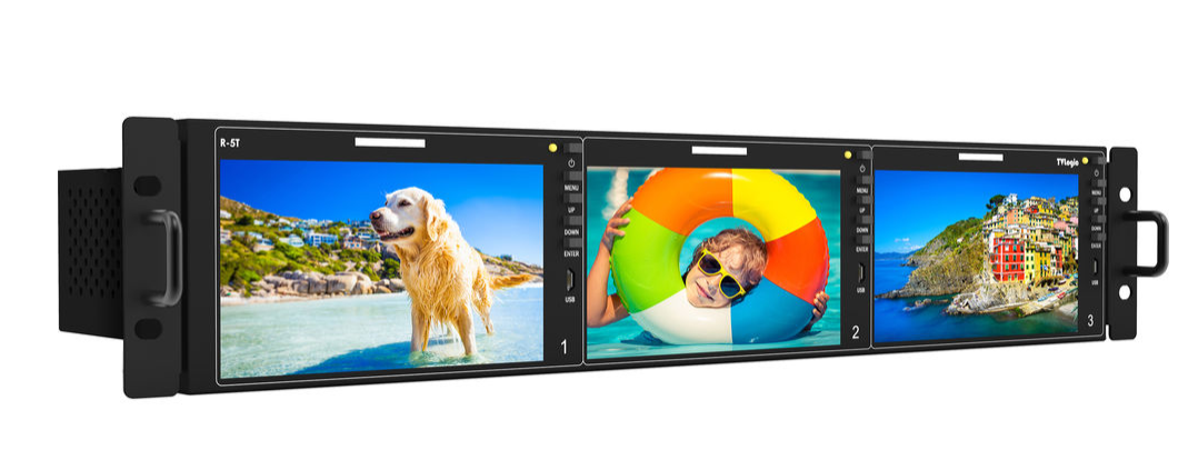 El TVLogic TVL-R-5T es un conjunto profesional para rack de 2U que incluye tres monitores Full HD de 5,5" con entradas 12G-SDI, 3G-SDI y HDMI 1.3. Cada monitor ofrece una nítida resolución de 1920 x 1080 con un brillo de hasta 500 cd/m² y está equipado con herramientas de vídeo avanzadas, como visualización de forma de onda, vectoscopio, código de tiempo y monitorización de nivel de audio para un ajuste preciso de múltiples cámaras.
