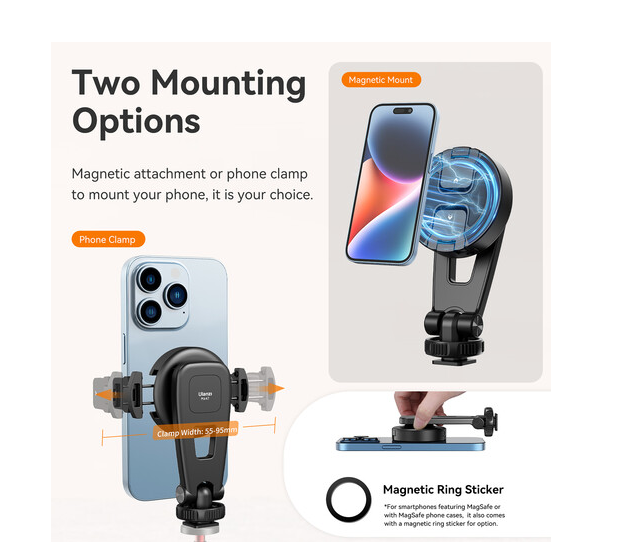 Este soporte magnético para smartphone 2 en 1, ligero pero resistente, ofrece portabilidad, flexibilidad y un ajuste rápido para la creación de contenido diaria.
